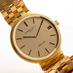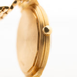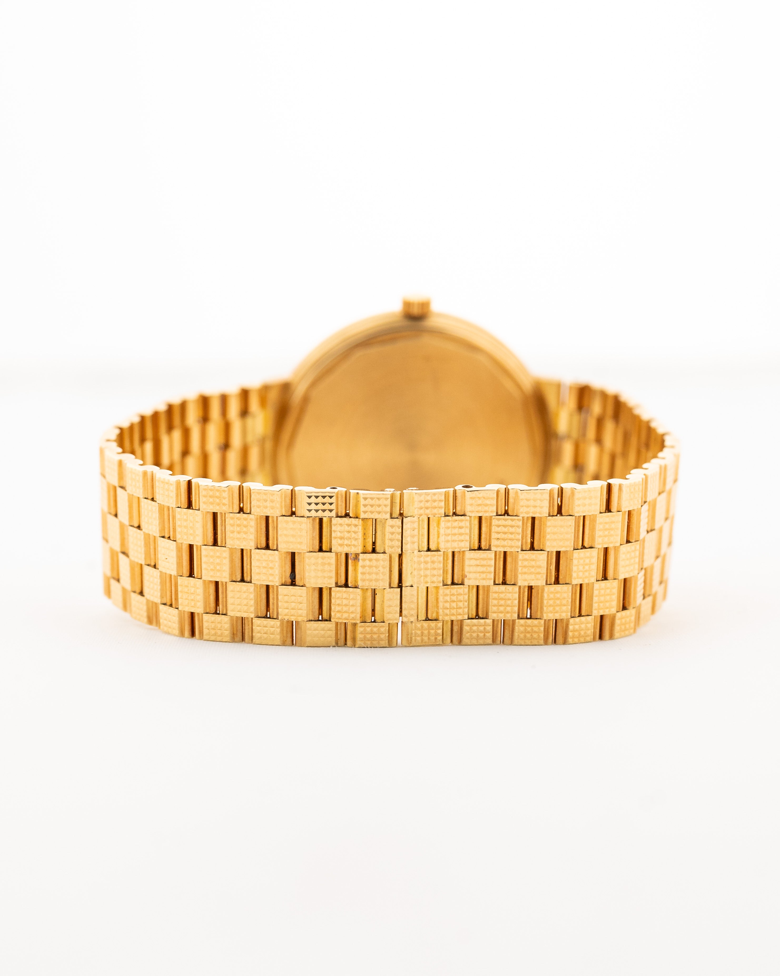直徑 34 mm 的 18K 黃金錶殼保存完好,搭配非常獨特的 18K 黃金精美滾釘錶帶 (Gilbert Goschen)。罕見的滾釘錶盤更是錦上添花。