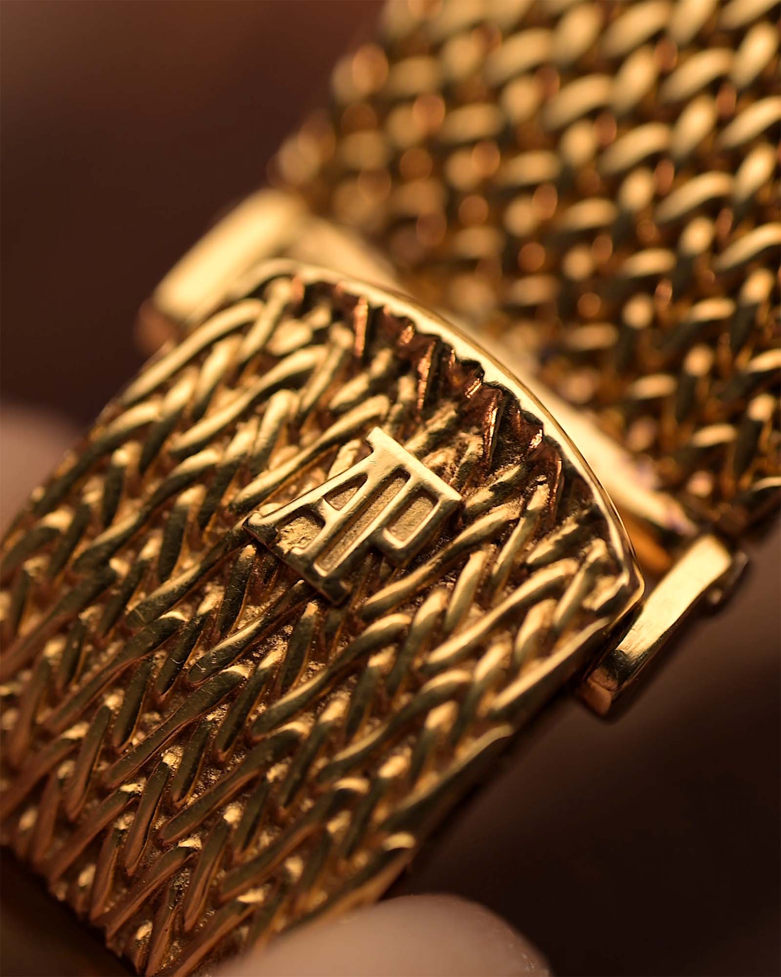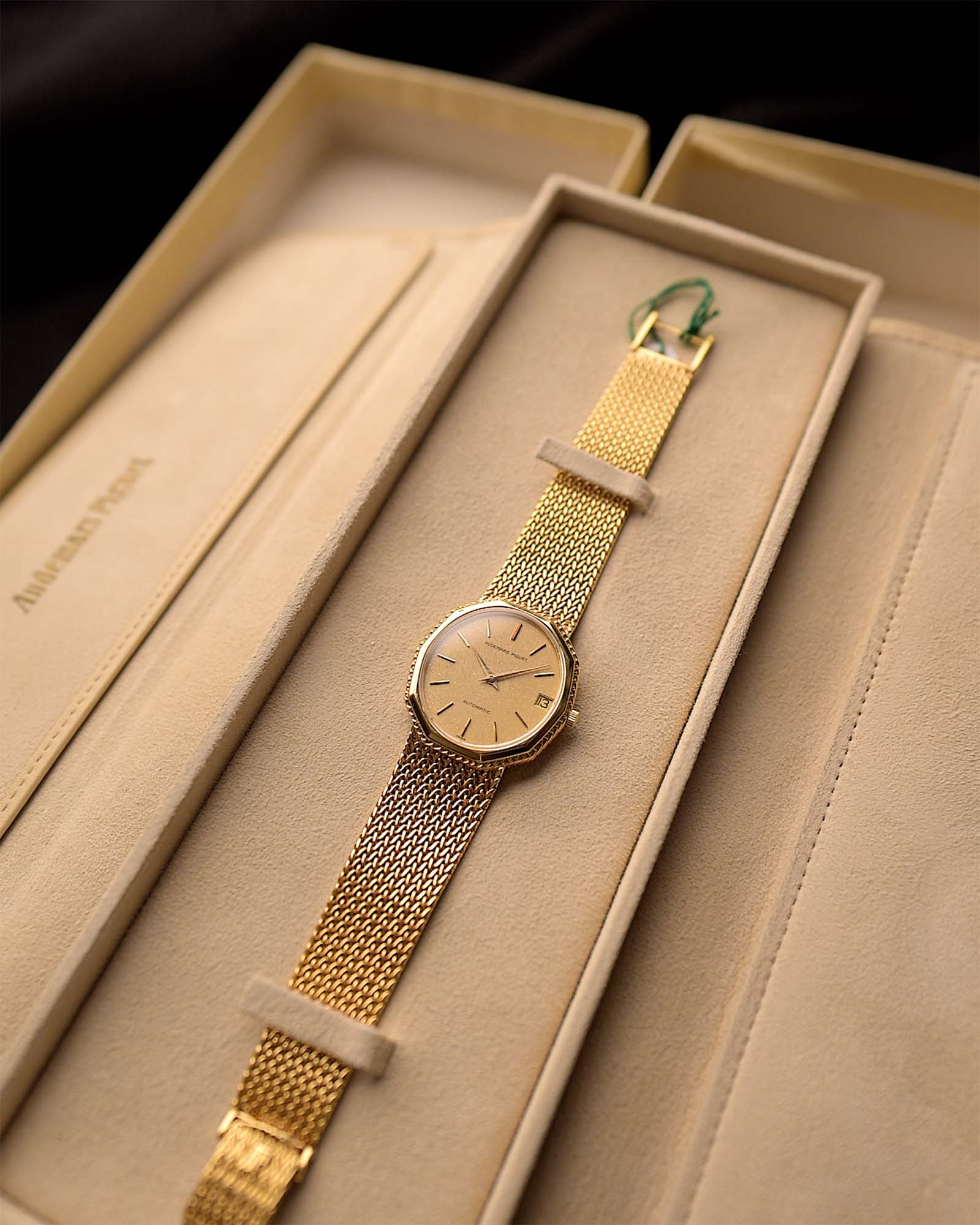這款1970年代的愛彼禮服腕表以罕有的階梯式十角形錶殼脫穎而出,錶殼完全以18K黃金打造。橢圓形的金色錶盤繼續呈現幾何與質感的互動,其微妙的閃爍光澤在每一個動作中都能捕捉光線。