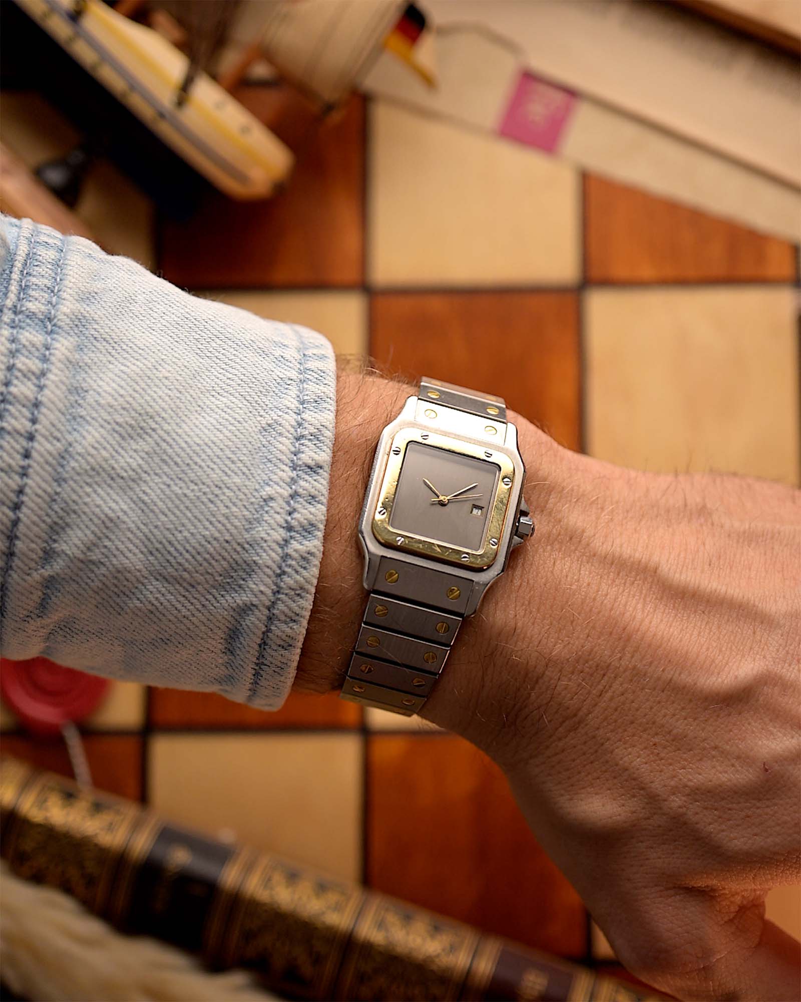 Crafted in two-tone steel and 18k yellow gold, the 29mm case is paired with the signature Cartier bracelet featuring golden screws — a design rooted in the original 1904 Santos, reimagined in the bold language of the 80s.