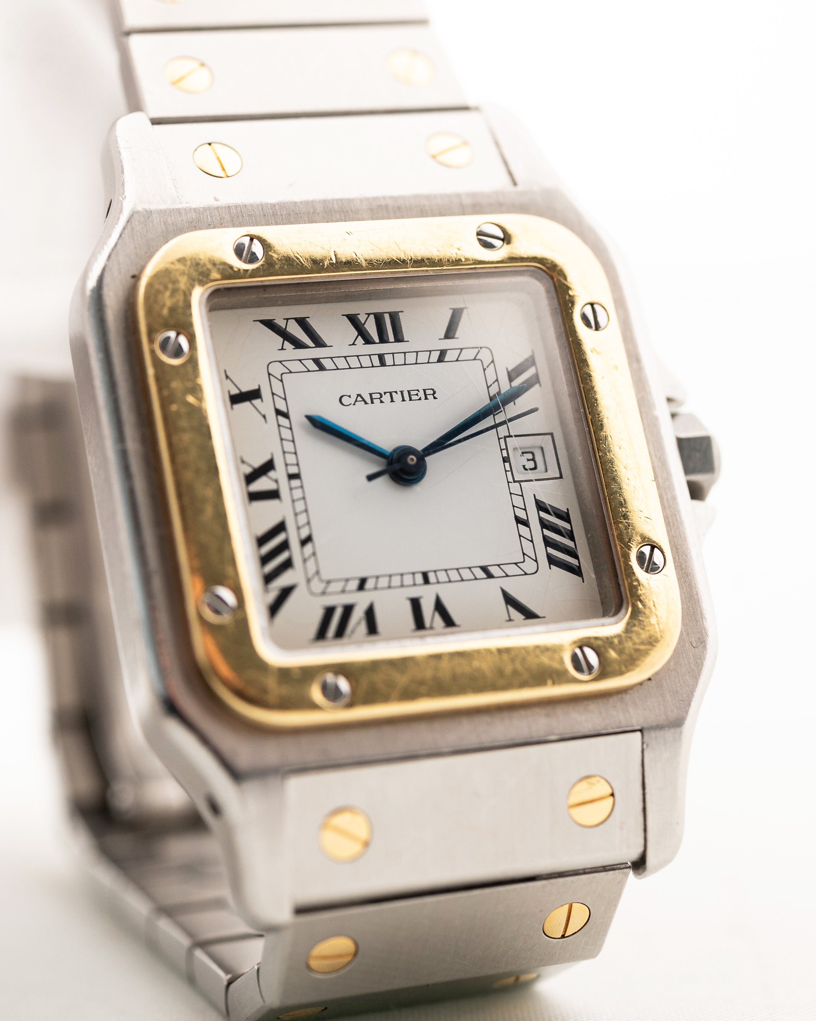 這款雙色不銹鋼 Cartier Santos Carrée 配備白色錶盤、藍鋼指針,當然還有 18K 金點綴,令人眼前一亮。