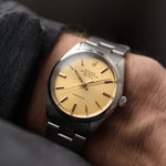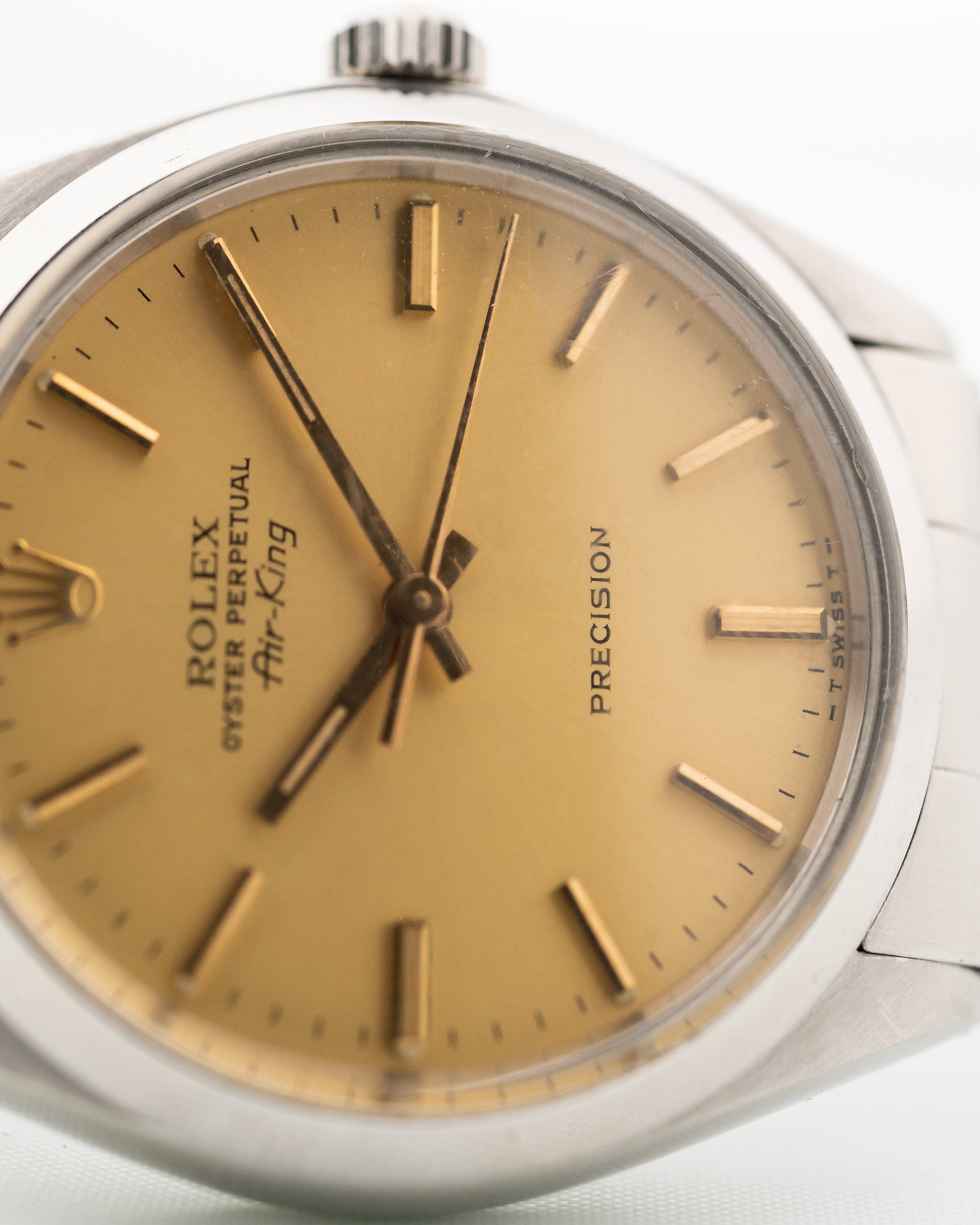 Air-King 是勞力士最後推出的低調錶款之一,擁有蠔式恆動系列的所有經典風格。此款腕錶以簡約為優勢 - 在此款腕錶中,罕見的簡潔金色錶盤搭配金色鑲貼刻度,清晰易讀,而寬闊的紋路指針則增添了整體的優雅氣質。