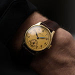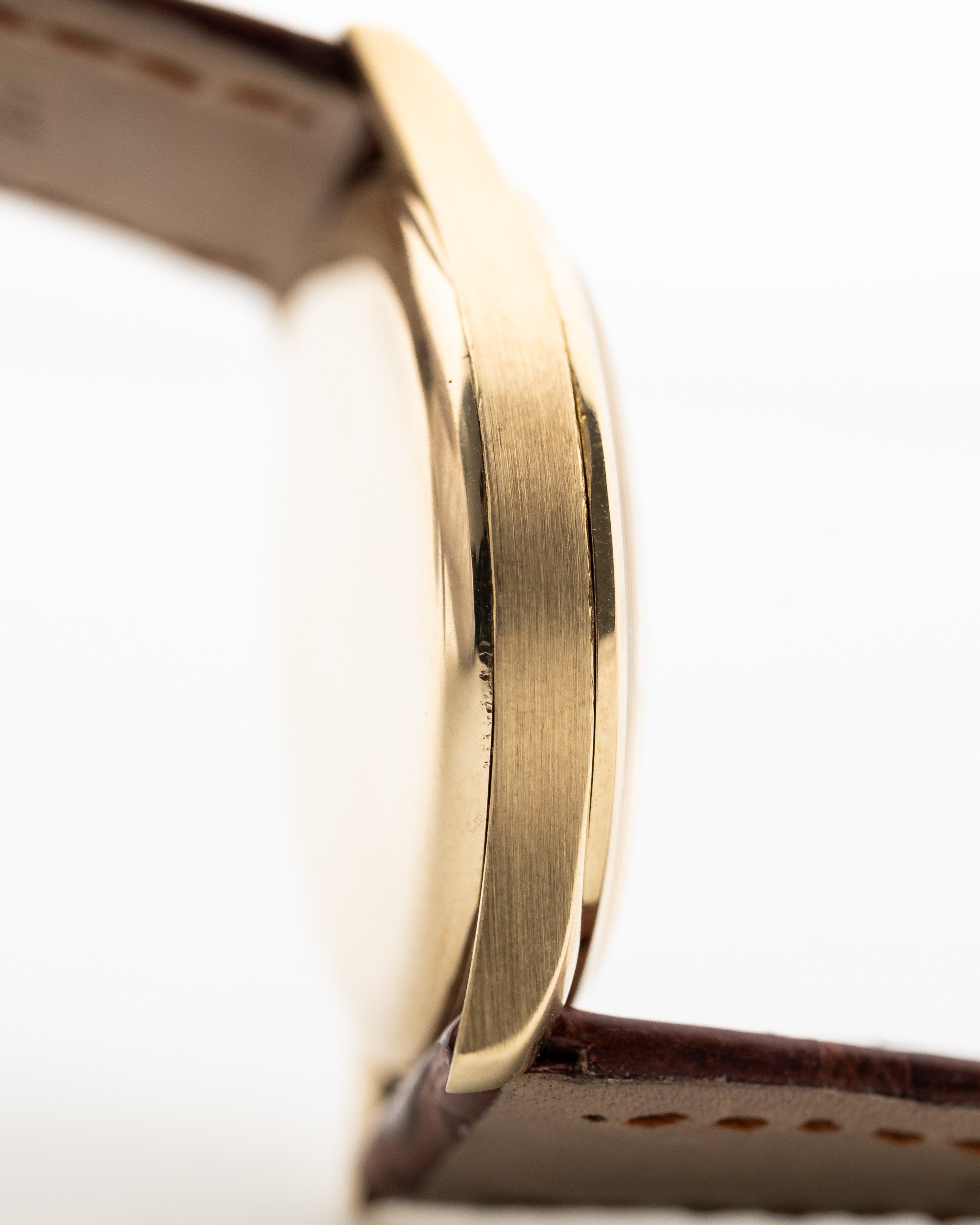 我們這款來自 1937 年的腕錶,擁有黃金錶殼、略呈天使形的錶耳以及美麗的金色副秒針鐵道錶盤,將是任何人收藏的常備款式,尤其是它擁有如此優異的狀況。