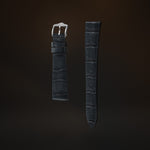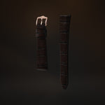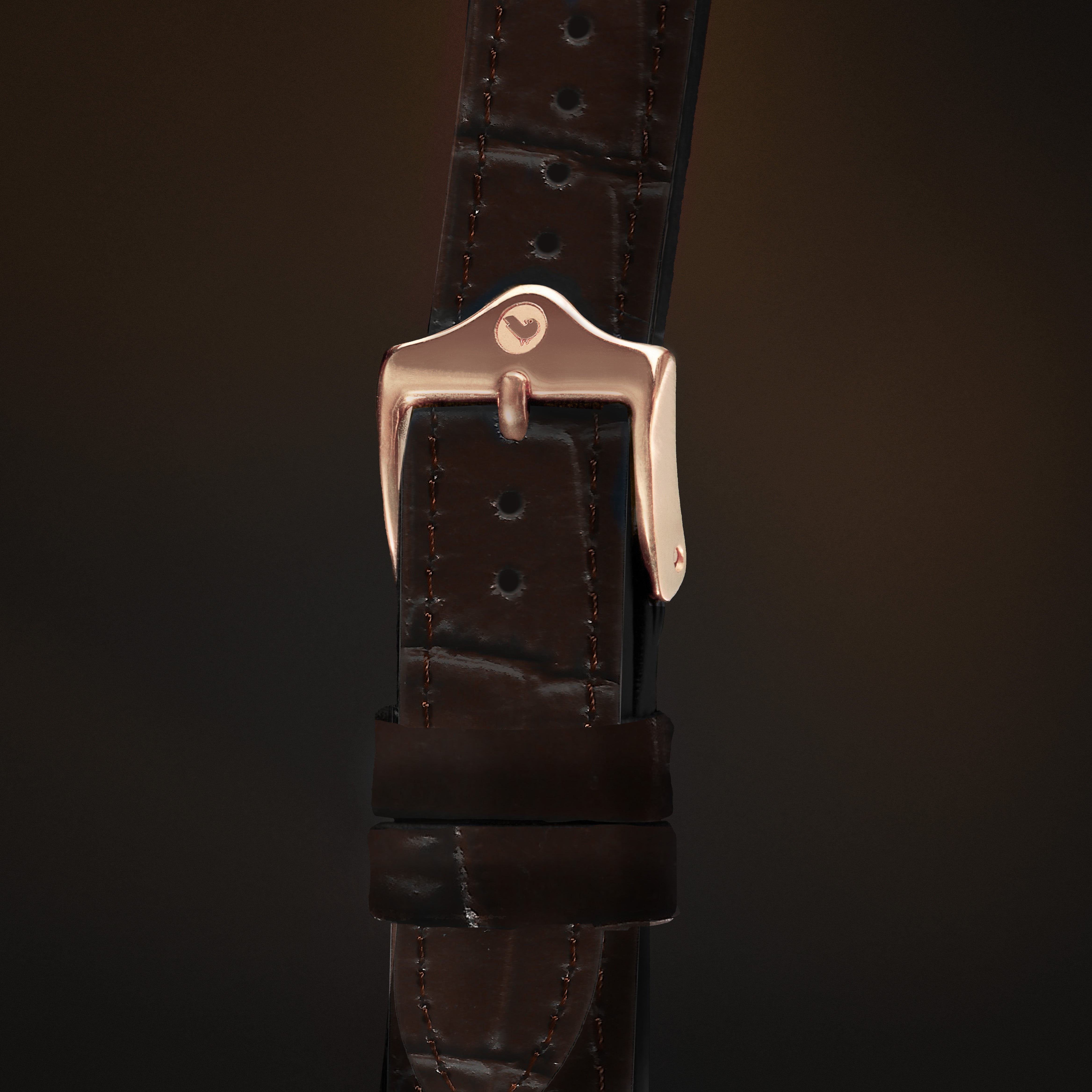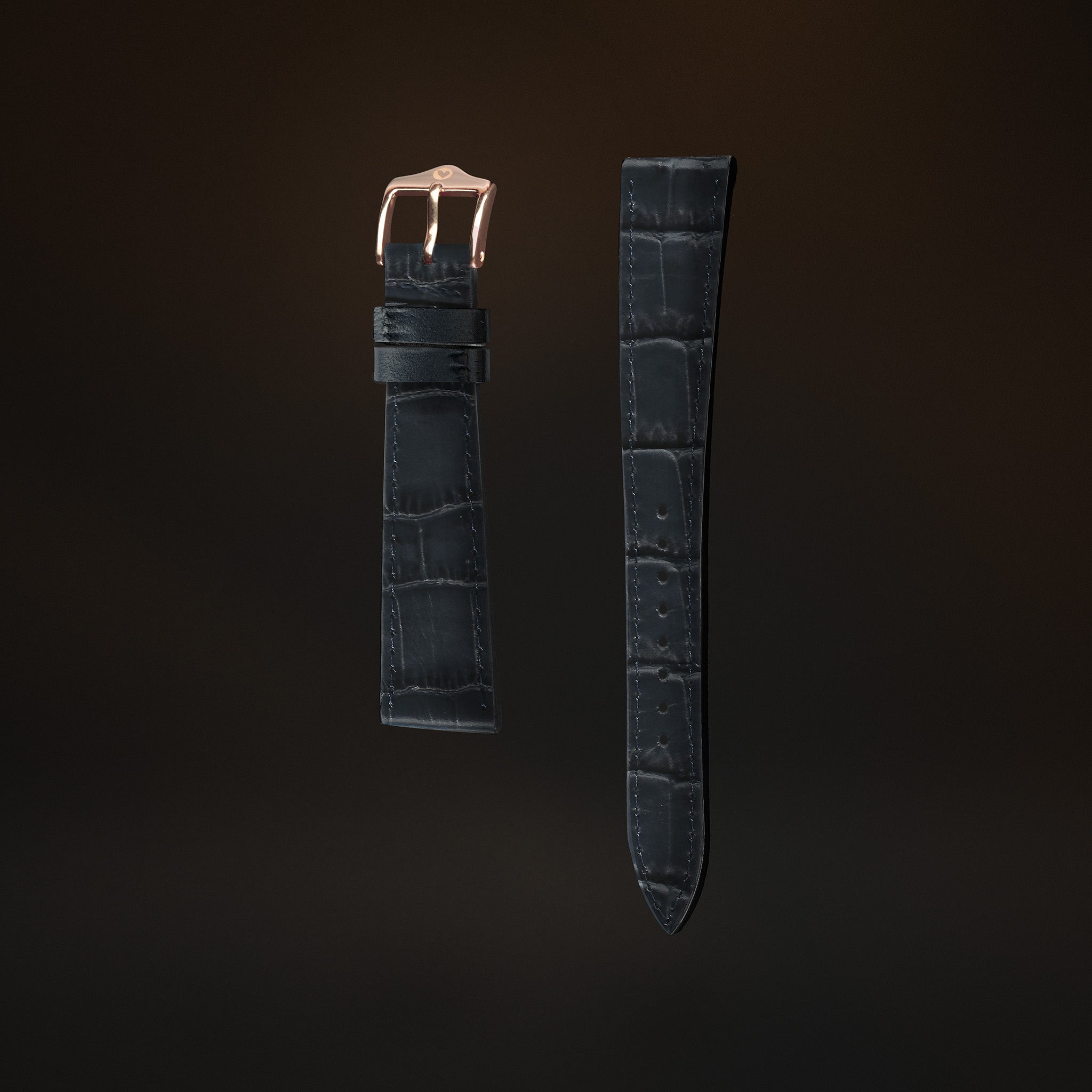 錶帶以優質的義大利小牛皮製成,飾有壓紋鱷魚圖案,在提供亮澤質感的同時兼具永續性。錶帶僅薄 2 mm,第一次配戴就能完美貼合手腕。獨特的錐形設計為您的經典復古腕錶襯托出完美的框架。