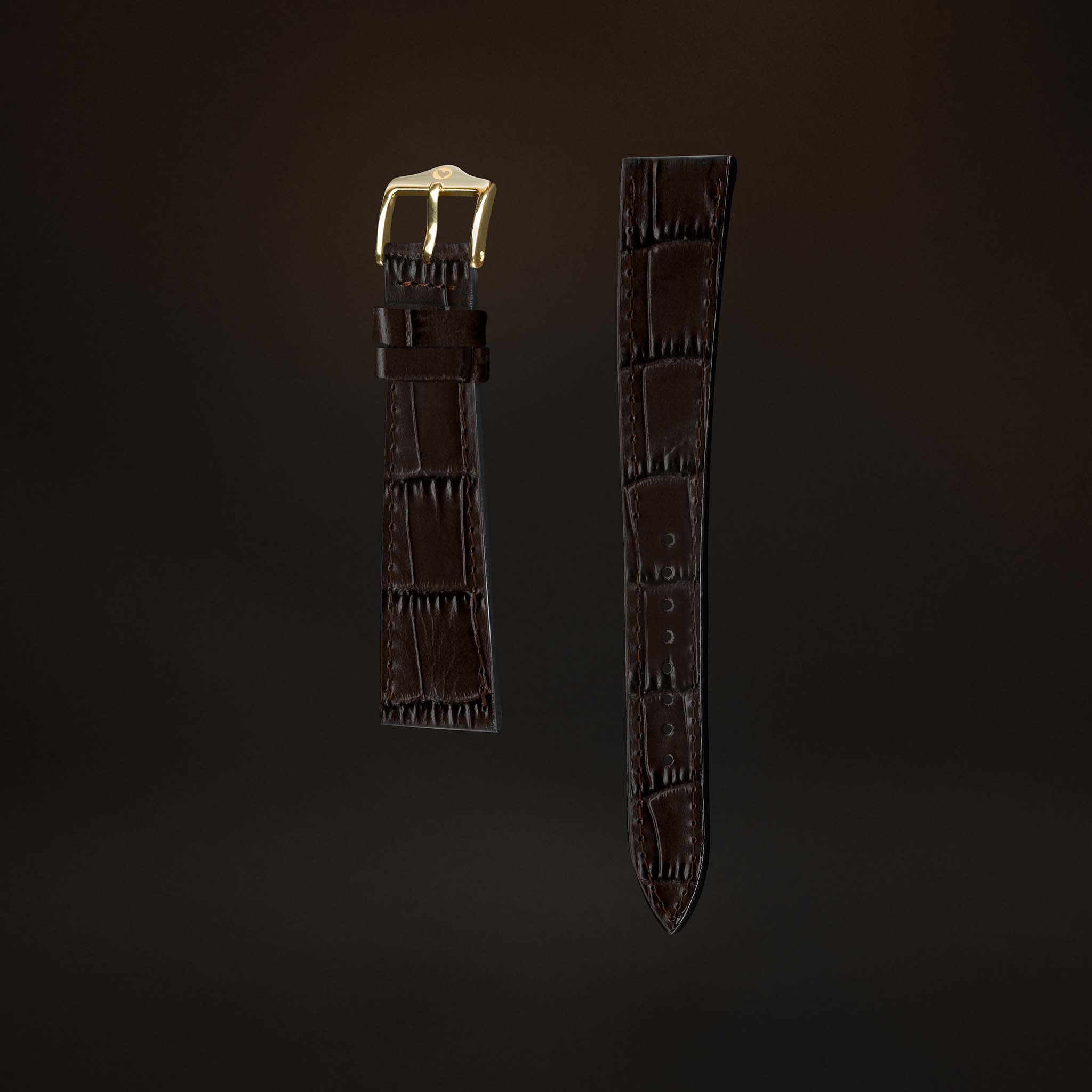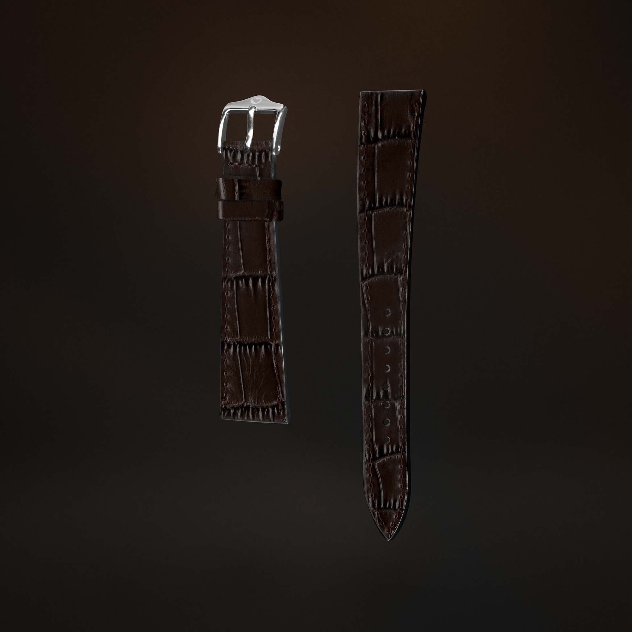 錶帶以優質的義大利小牛皮製成,飾有壓紋鱷魚圖案,在提供亮澤質感的同時兼具永續性。錶帶僅薄 2 mm,第一次配戴就能完美貼合手腕。獨特的錐形設計為您的經典復古腕錶襯托出完美的框架。