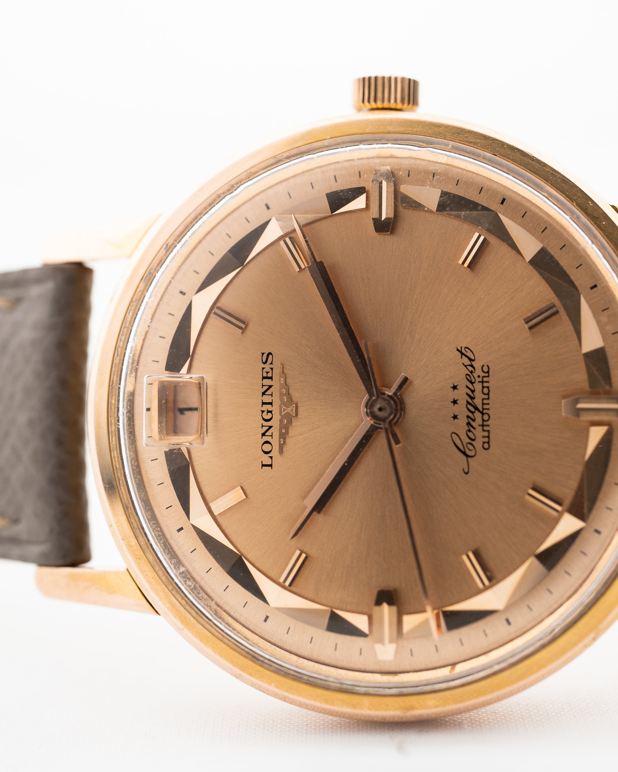 這款 Longines Conquest 配備 18K 玫瑰金錶殼,是正裝腕錶的典範。蝙蝠形錶軌和分鐘錶軌之間設有刻面章環,此外還有圓盤錶盤。這款錶盤在光線下的效果絕對令人驚嘆。