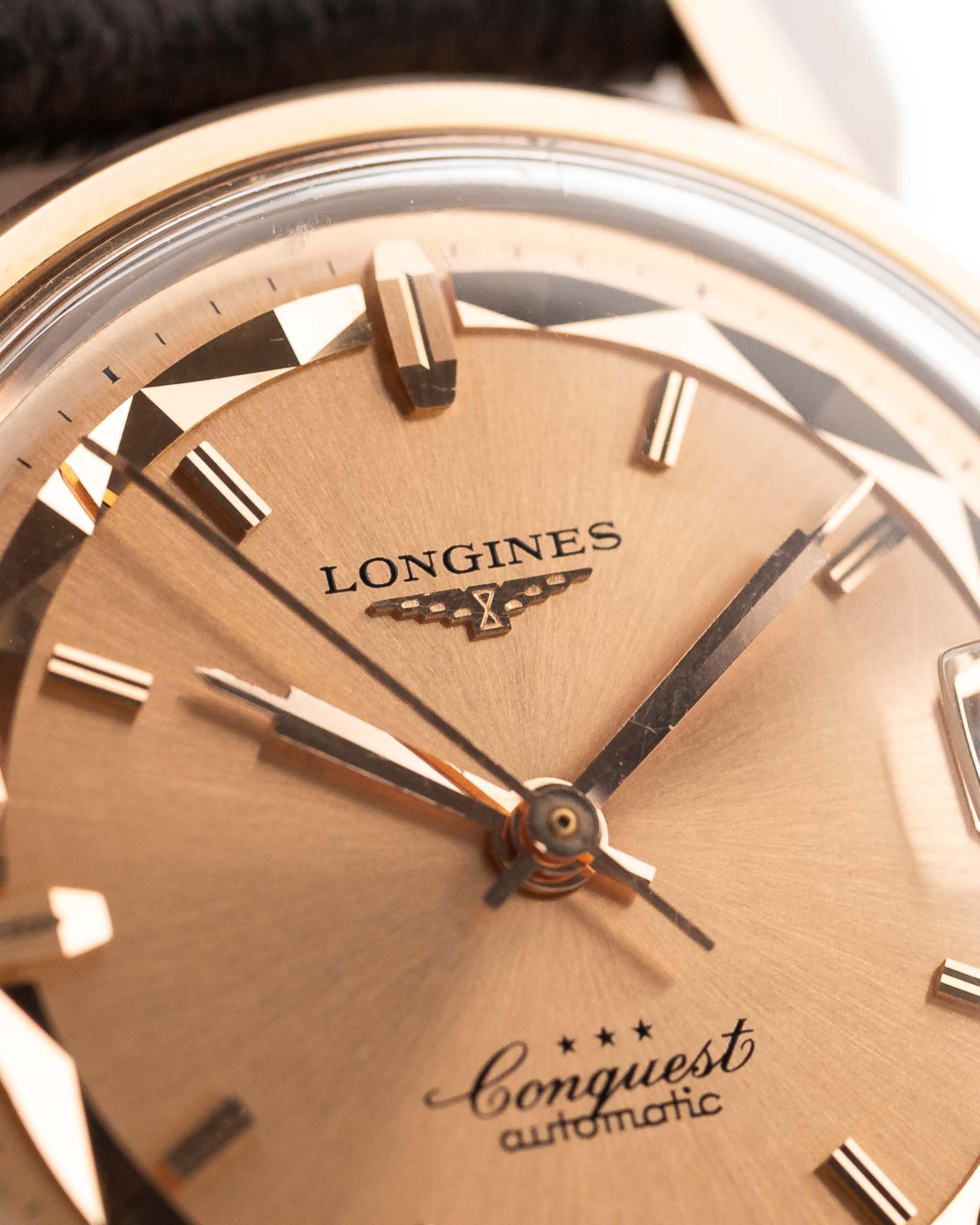 這款 Longines Conquest 18K 黃金錶殼是正裝腕錶的典範。蝙蝠形錶軌和分鐘錶軌之間設有刻面章環,此外還有圓盤錶盤。這款錶盤在光線下的效果絕對令人驚嘆。