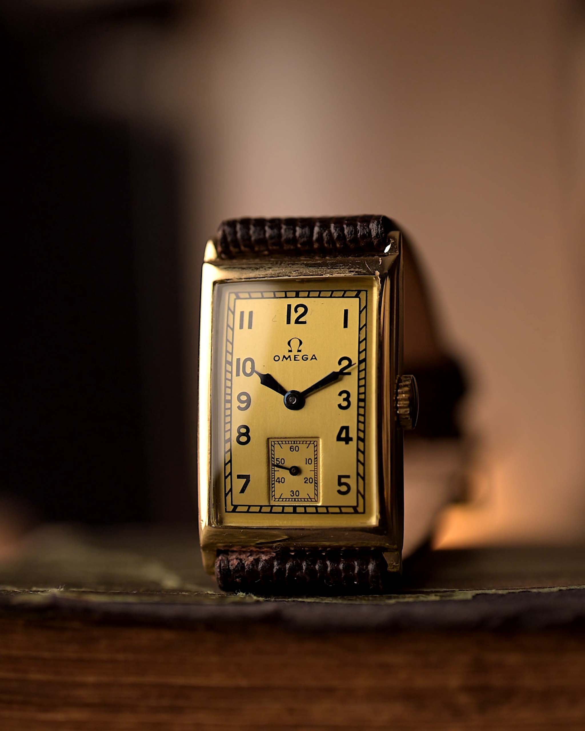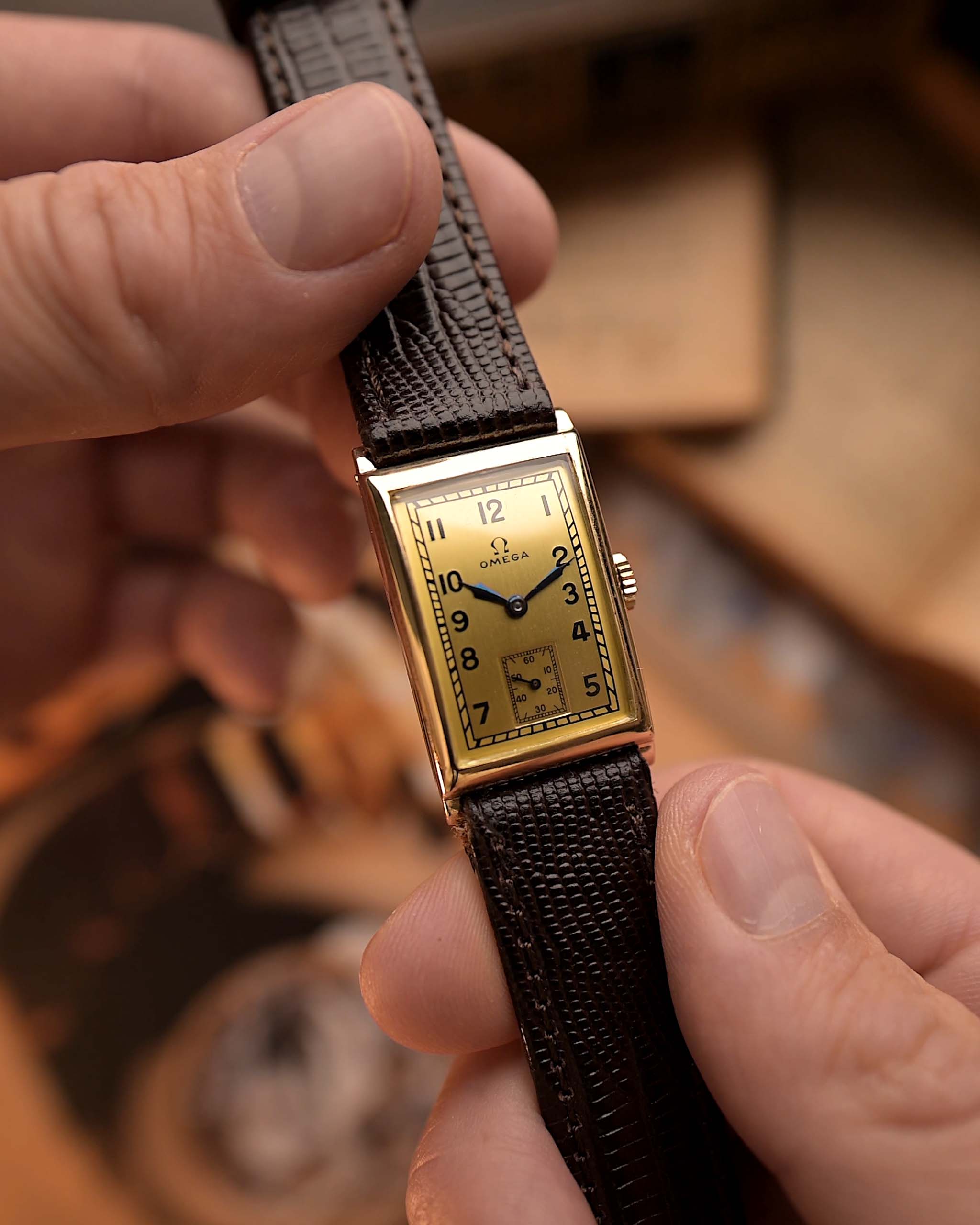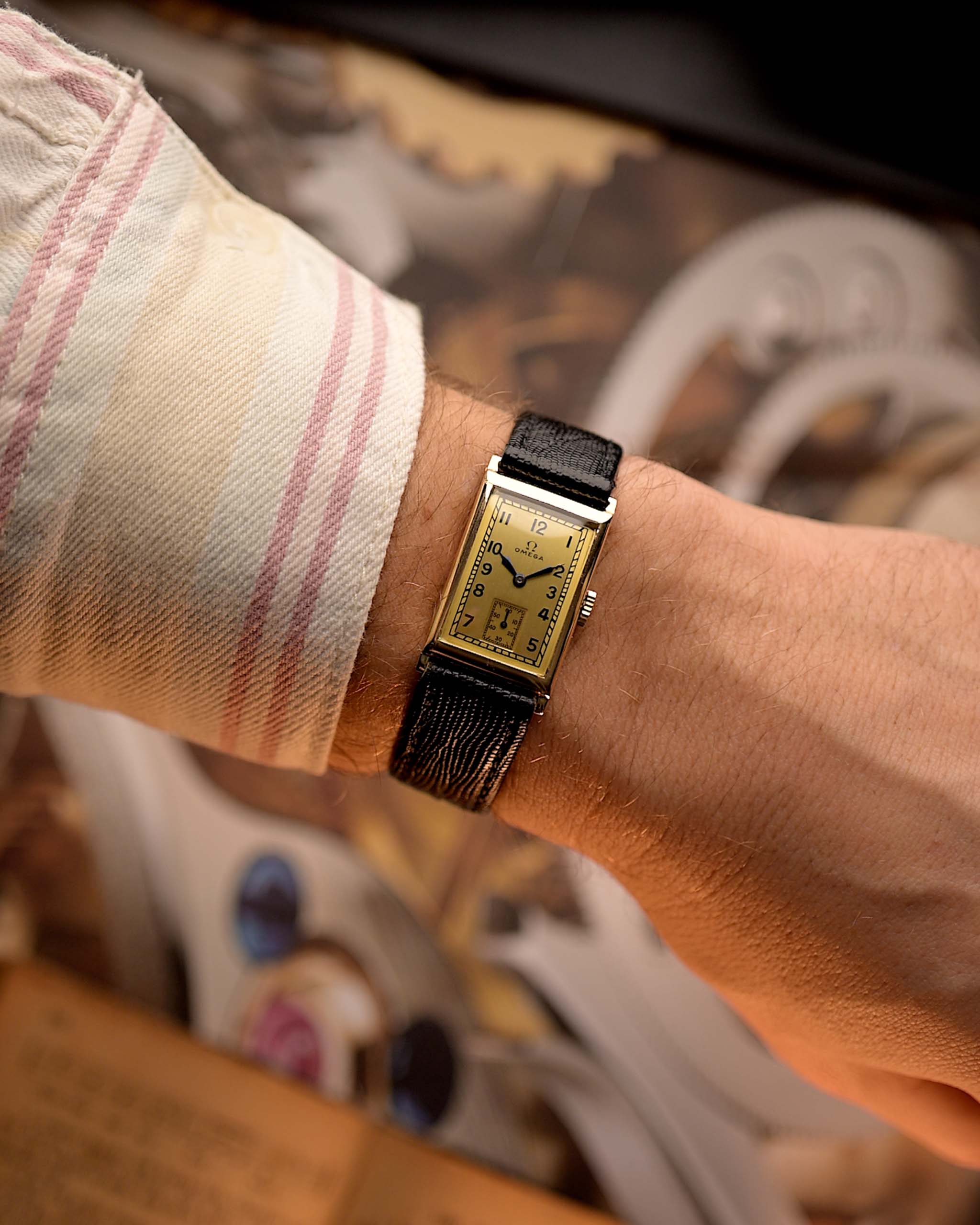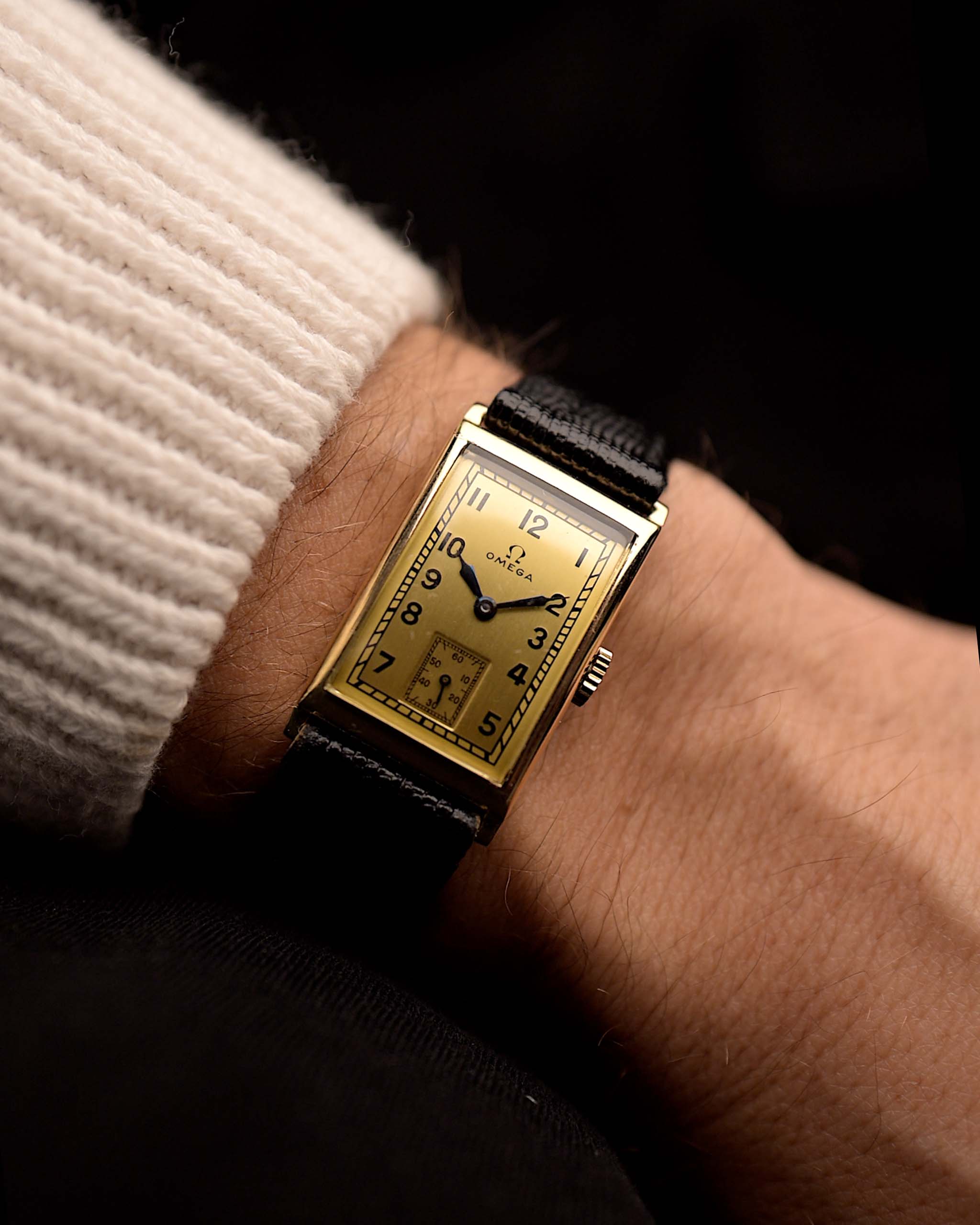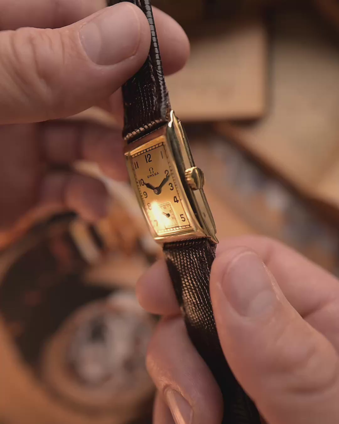 這款罕見的Omega 正裝腕錶來自 1935 年,體現了裝飾藝術時代的優雅氣質。長方形的 14K 黃金錶殼展現出腕間醒目而優雅的輪廓。