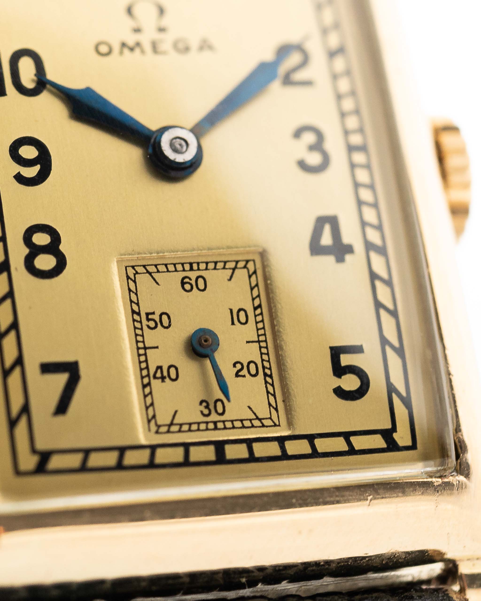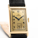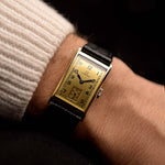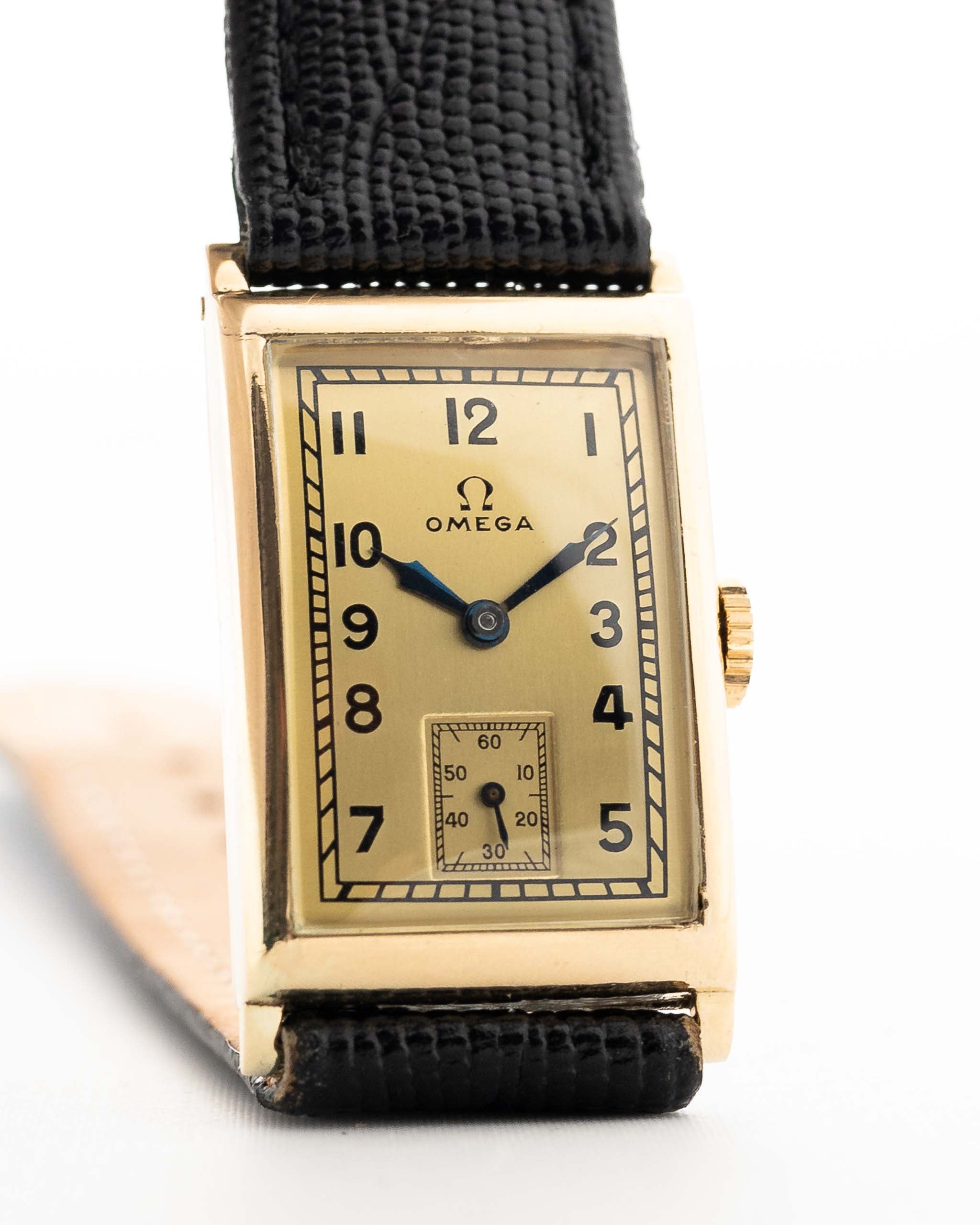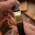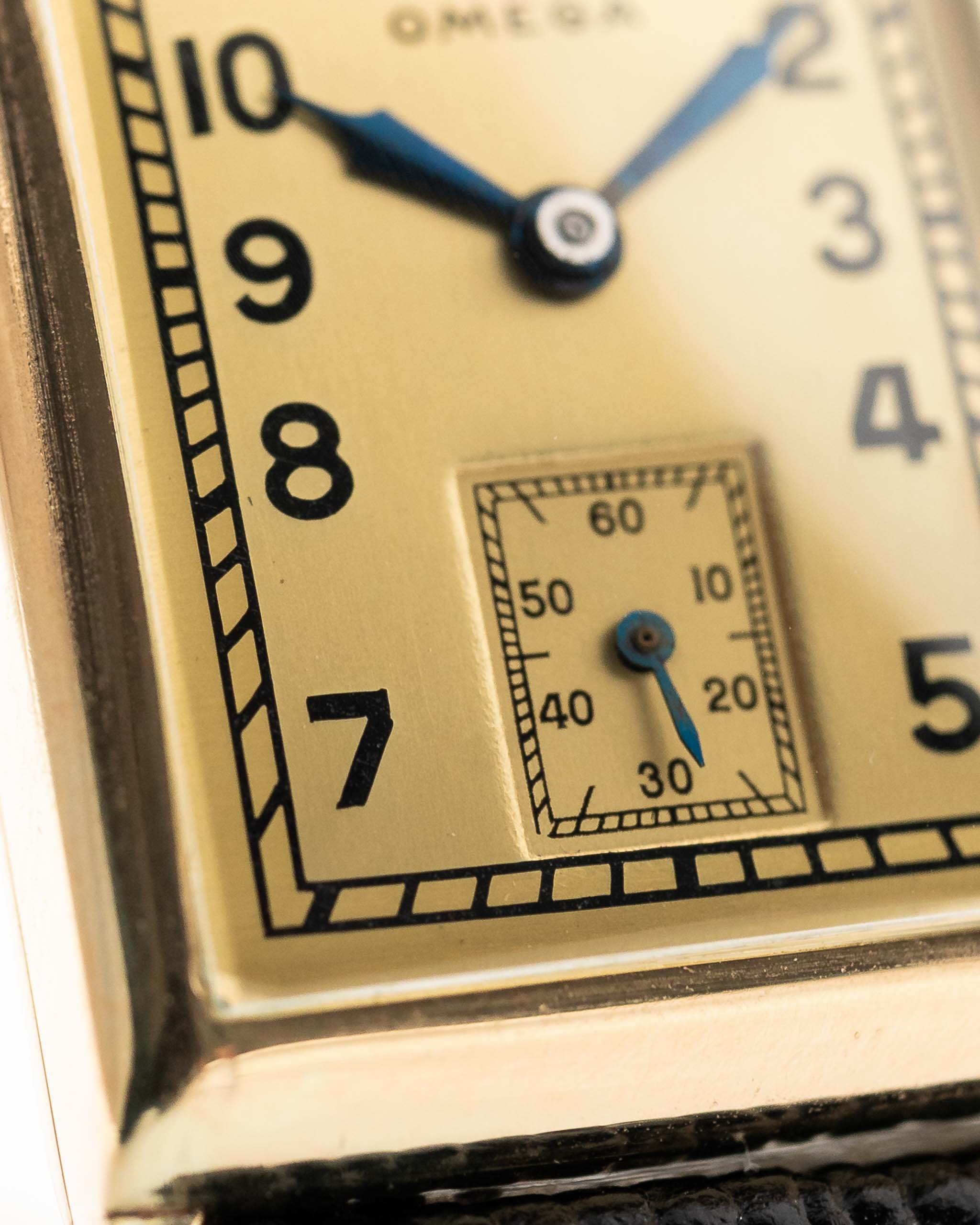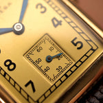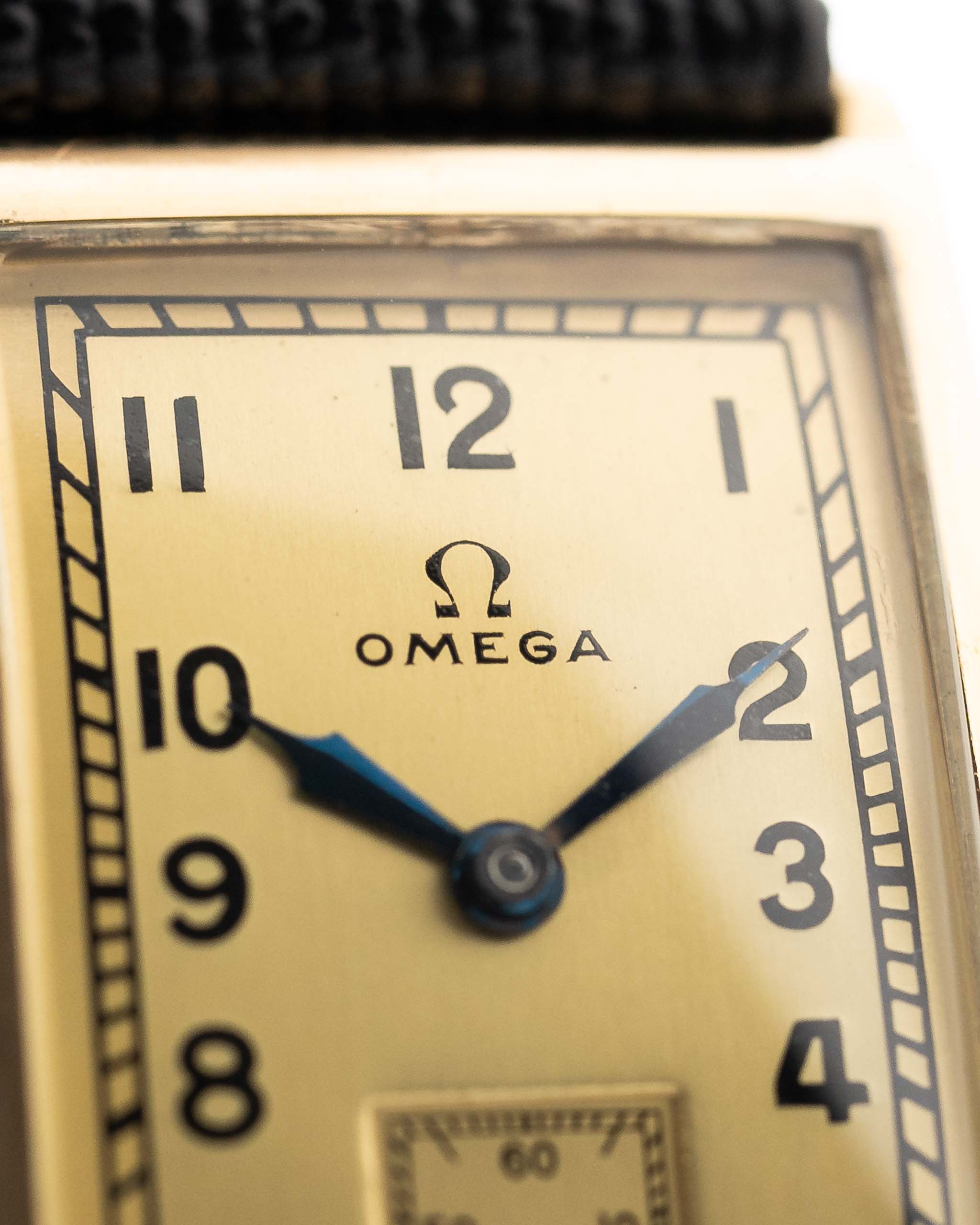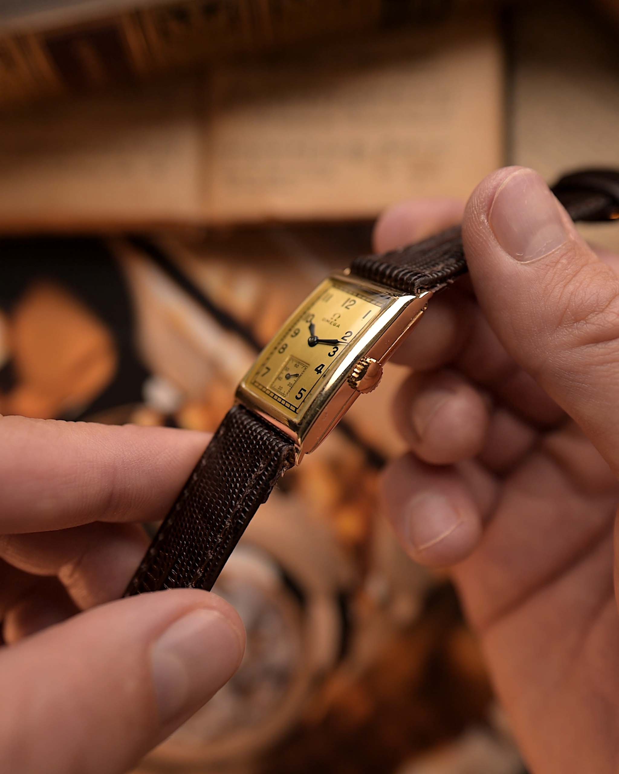 這款罕見的Omega 正裝腕錶來自 1935 年,體現了裝飾藝術時代的優雅氣質。長方形的 14K 黃金錶殼展現出腕間醒目而優雅的輪廓。