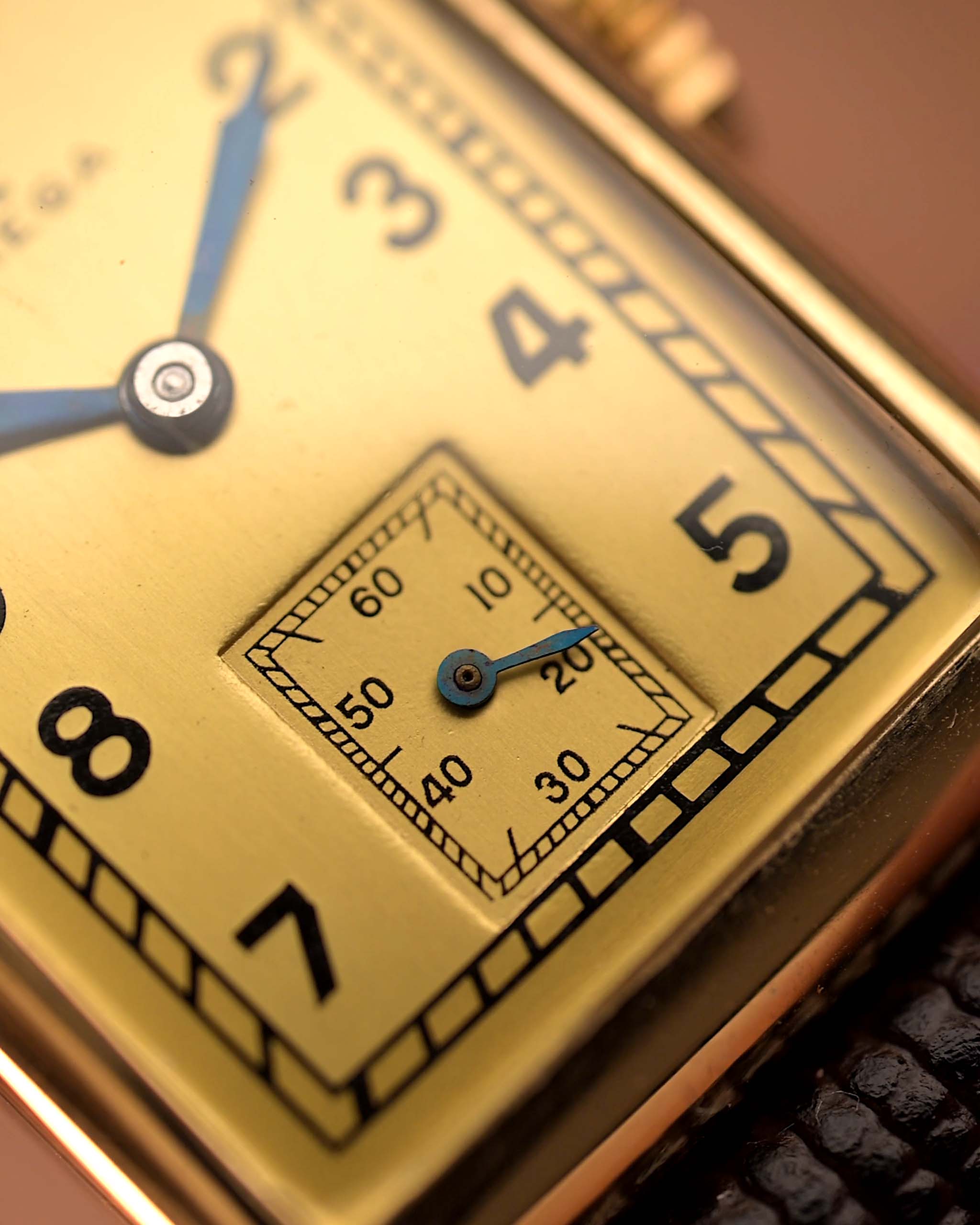 原封不動的金色錶盤上有美輪美奐的裝飾藝術阿拉伯數字、低調的輔助秒針讀,以及完美搭配的 藍鋼針筒指針- 細膩而精準。這樣的組合是純粹的復古詩意。