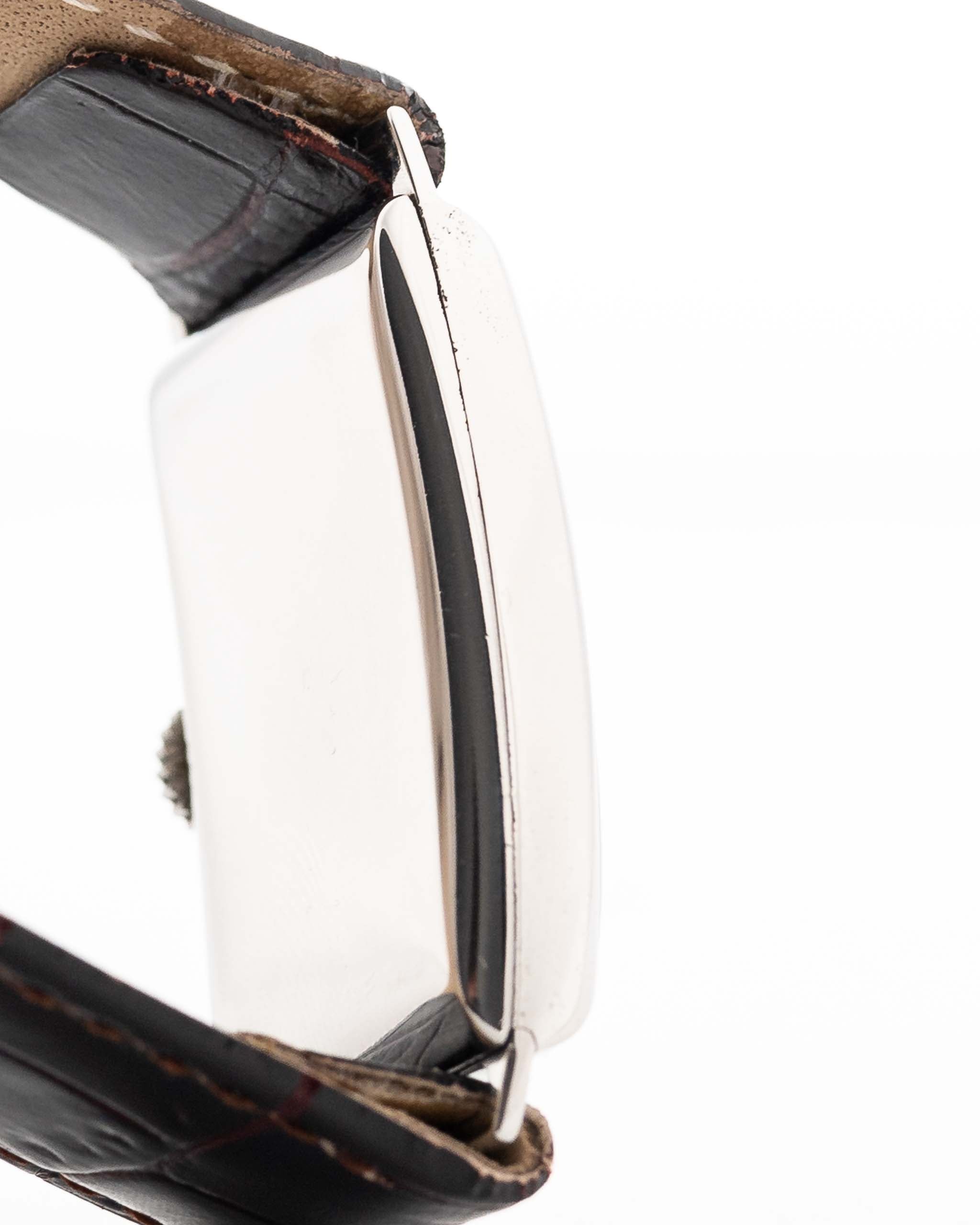 這款罕見的歐米茄禮服手表來自 1930年,體現了裝飾藝術時代的優雅氣質。長方形不銹鋼錶殼,佩戴時顯得比其尺寸大得多,在手腕上呈現出搶眼而優雅的輪廓。