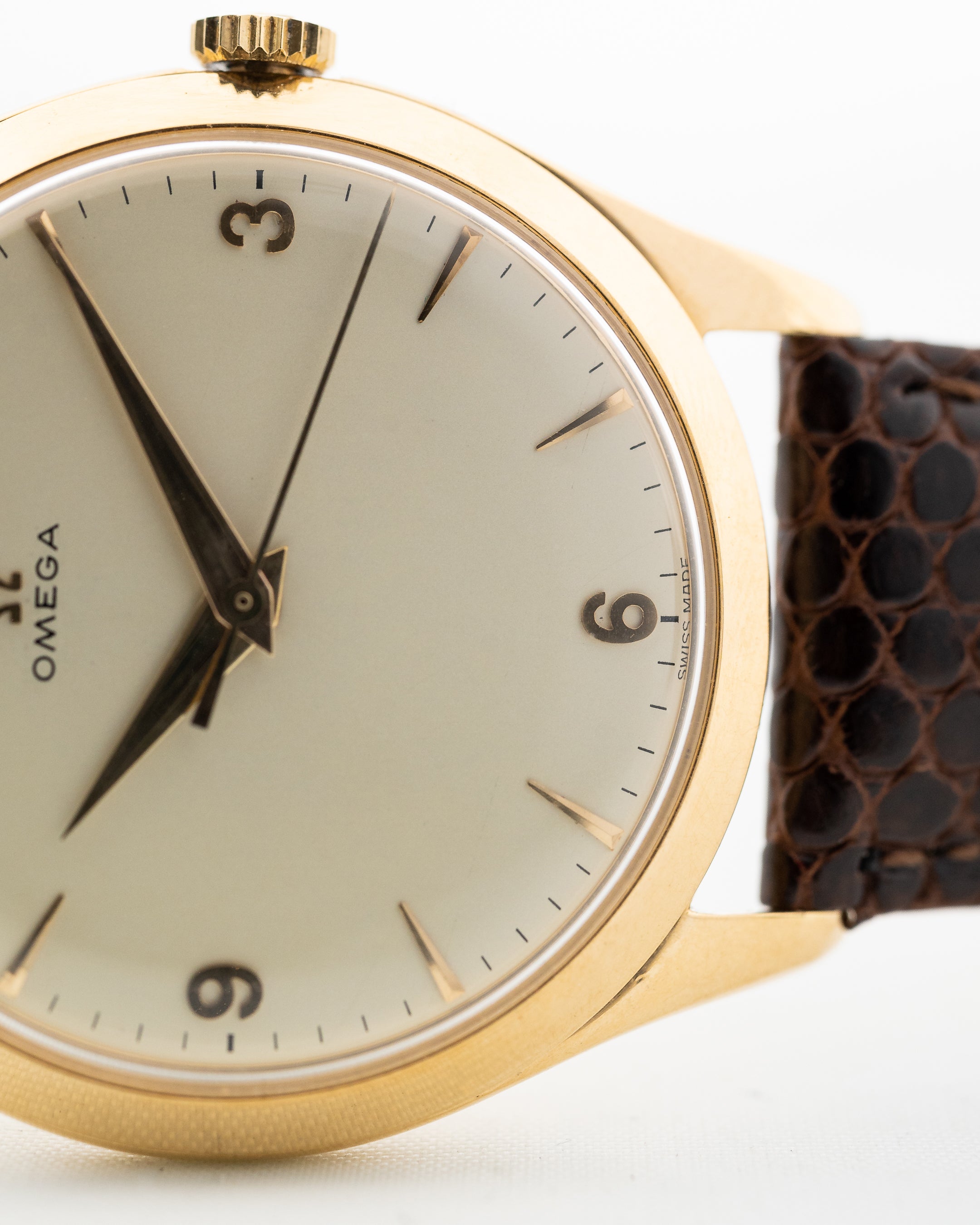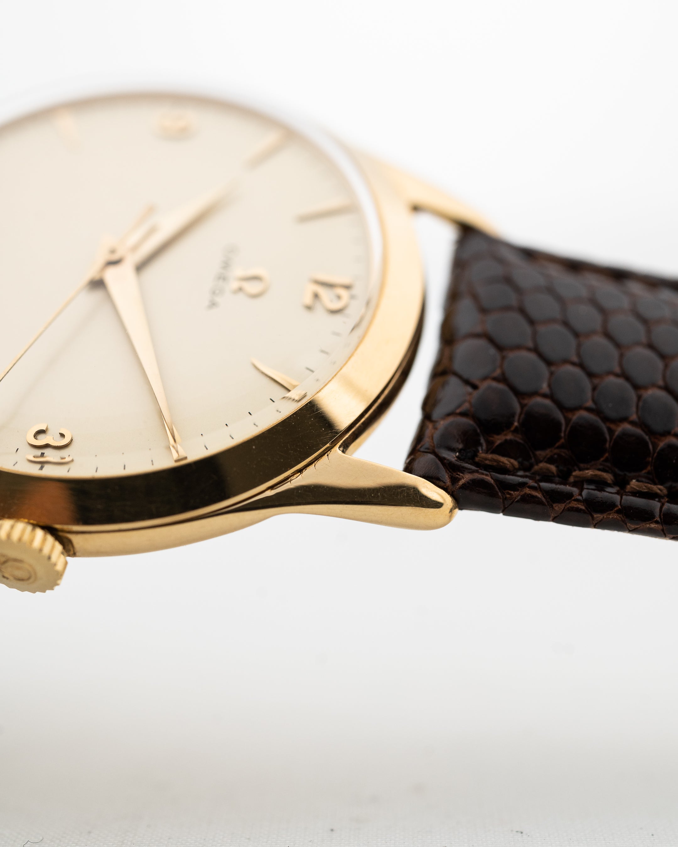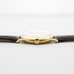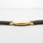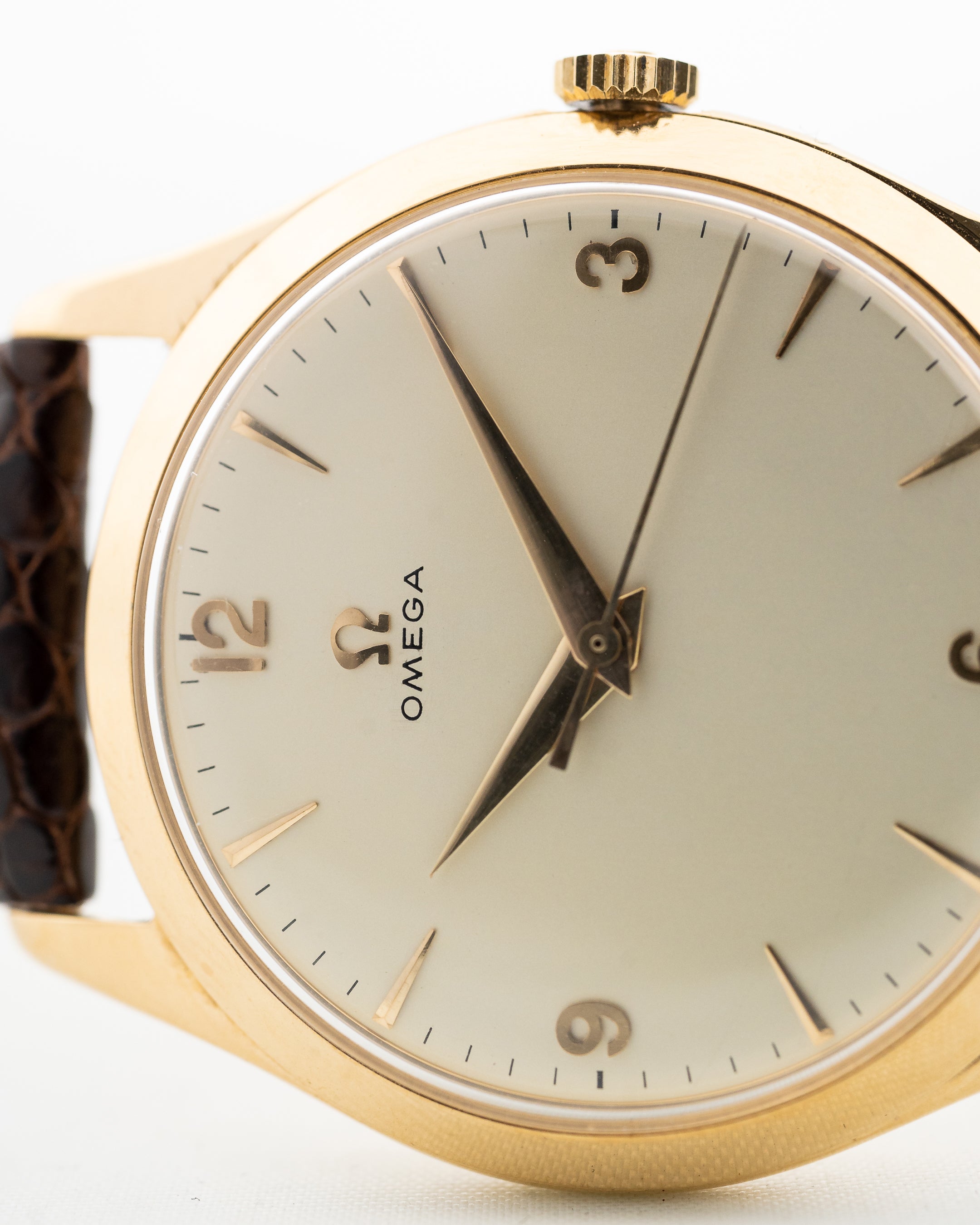 在此,您可以看到 Omega 於 1950 年製造的迷人正裝腕錶。這款腕錶擁有超大的 36 mm 18K 黃金錶殼,錶耳角度極佳,奶油色錶盤搭配黃金時標,令人驚艷,令人屏息。