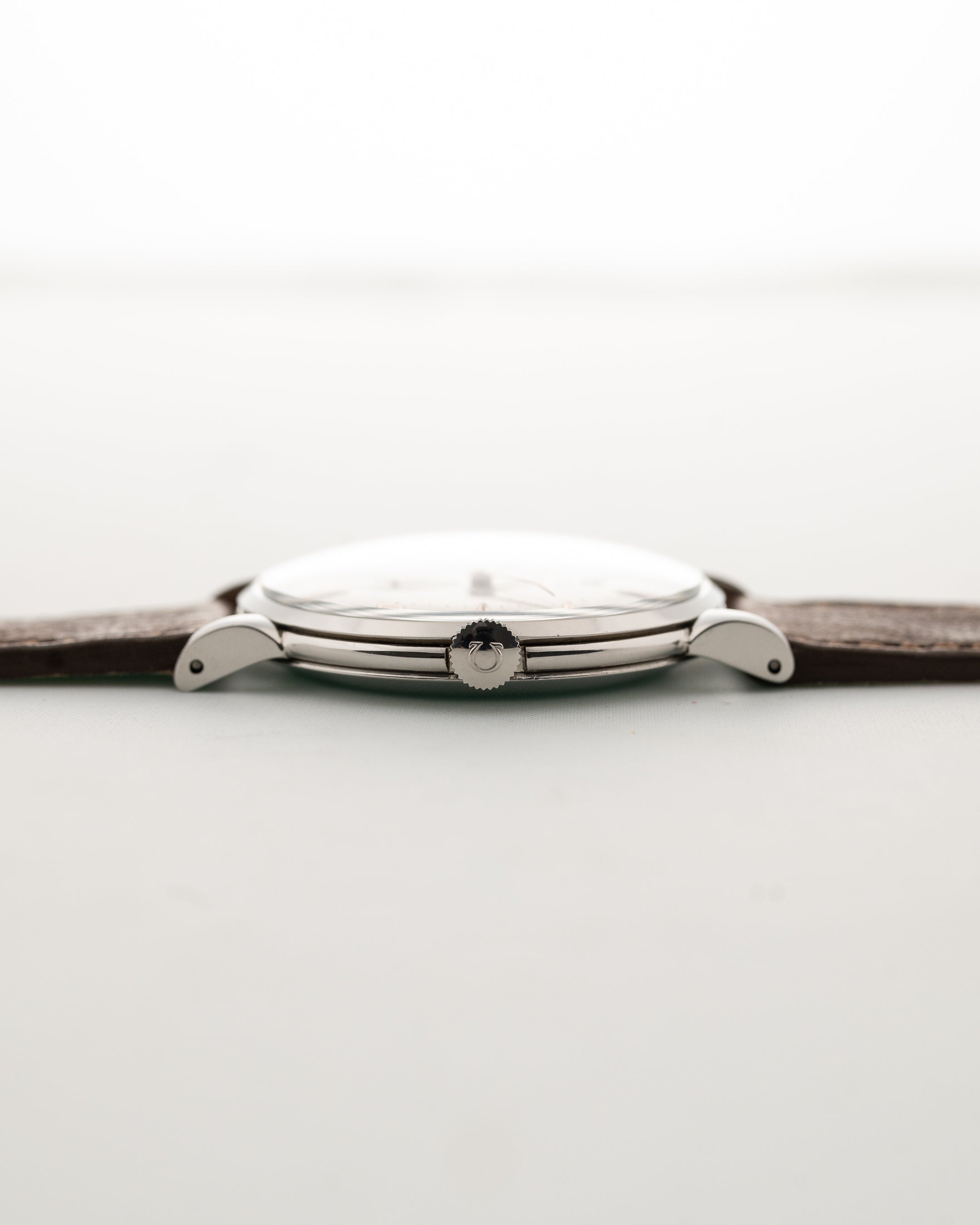 在此您可以看到 Omega 於 1950 年製造的一款迷人的自動正裝腕錶。這款腕錶擁有 37.5 mm 的超大不銹鋼錶殼,搭配非常美觀的水滴形錶耳、美麗的白色/銀色雙色錶盤以及銅色時標和指針。