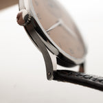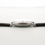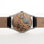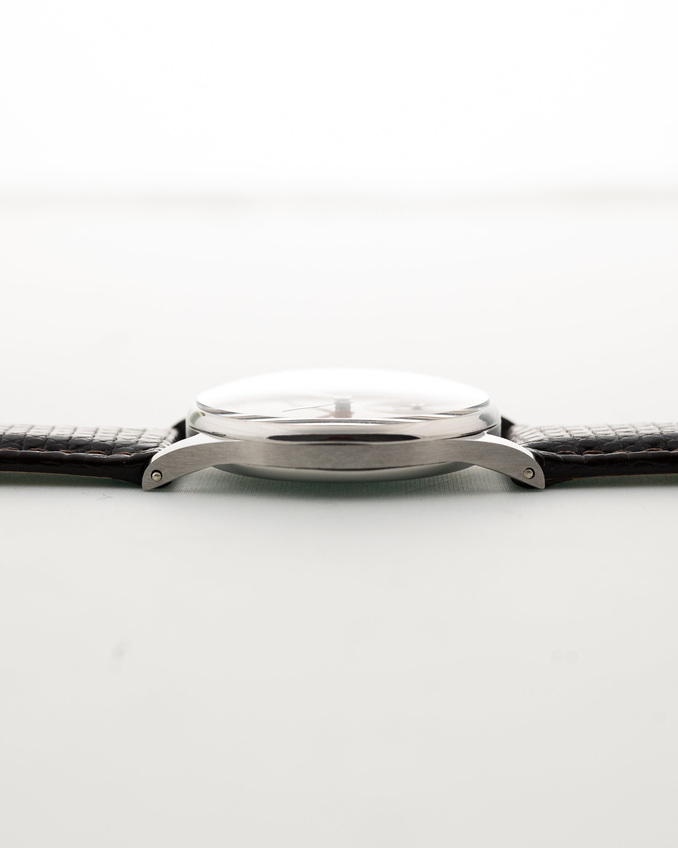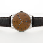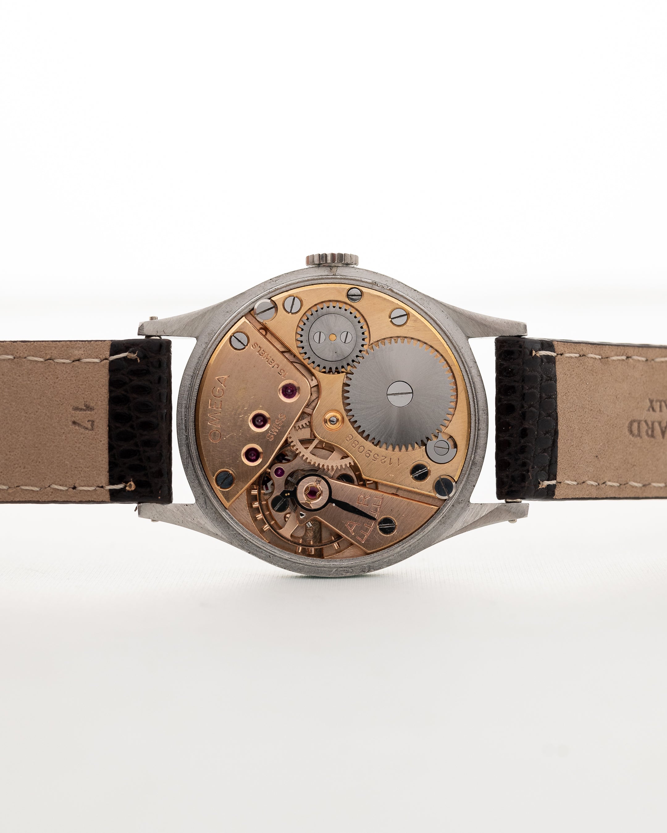 在此您可以看到 Omega 於 1947 年製造的迷人正裝腕錶。它擁有 33mm 不銹鋼錶殼、纖薄簡約的斜角錶耳、完美無瑕的卡布奇諾錶盤和不銹鋼葉形指針,是一款讓人屏息凝神的作品。
