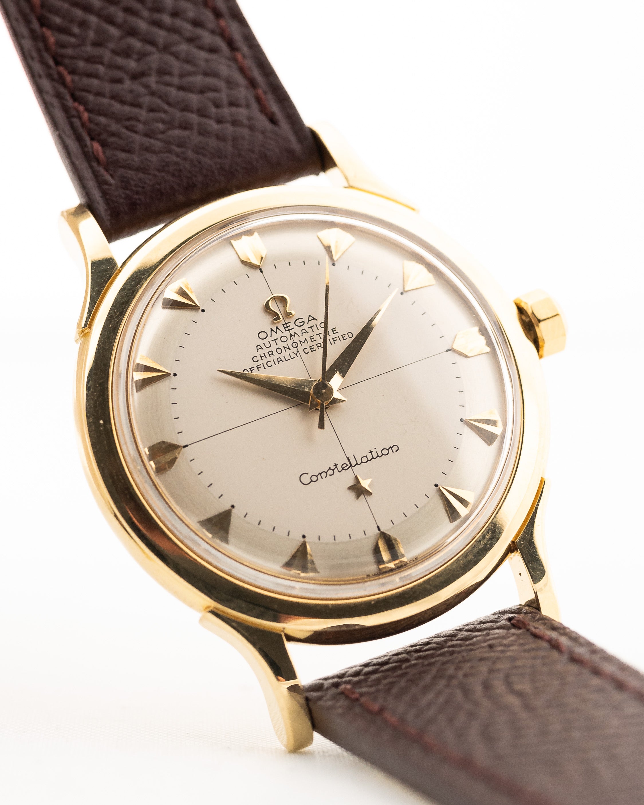 比例勻稱、簡潔而經典,這款 Constellation 配備旋入式錶背、Omega 354 自動天文台機芯和略呈角度的錶耳。