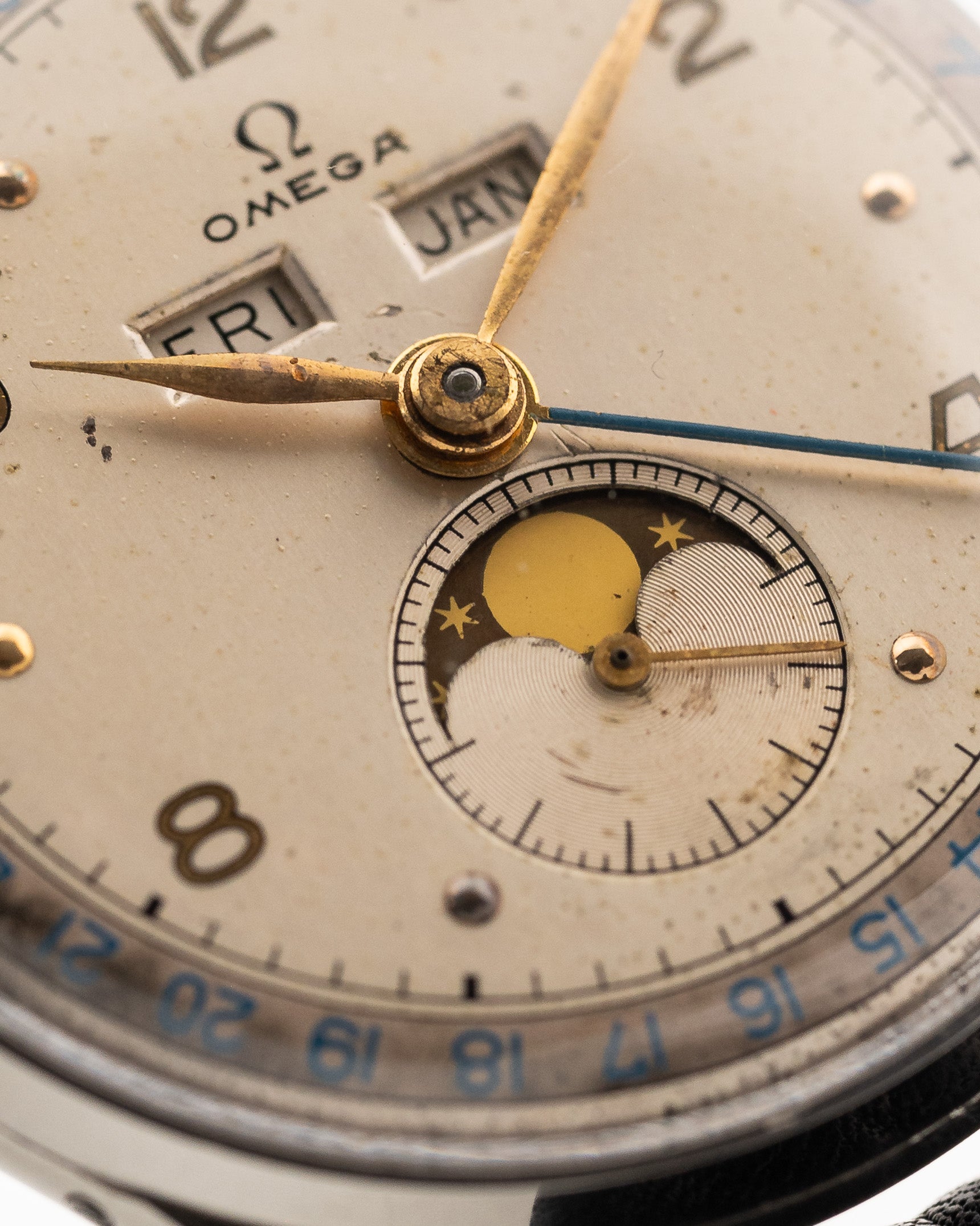 錶盤上半部設有星期和月份視窗,下半部的大型小秒盤內則設有月相顯示。錶盤的外圈有一個醒目的藍色日期章環。葉形指針與藍鋼日期指針均保存完好。