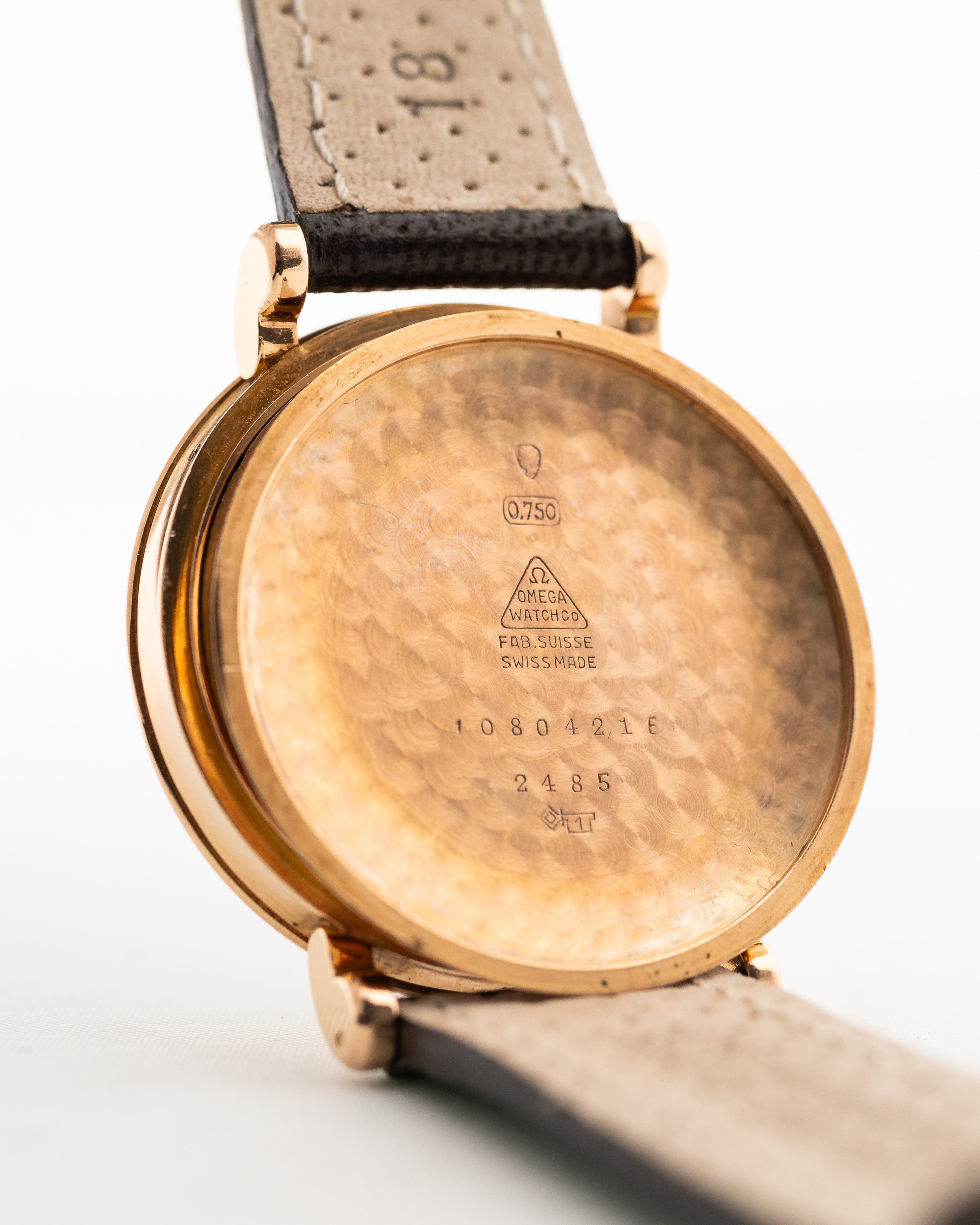Omega Cosmic 於 1947 年問世,在 1956 年之前一直是品牌目錄中最尊貴的腕錶。這款腕錶為 18K 玫瑰金 2485 型號,長 37.5 毫米,搭載以 Lemania 為基礎的 Omega Calibre 27 DL PC 機芯。