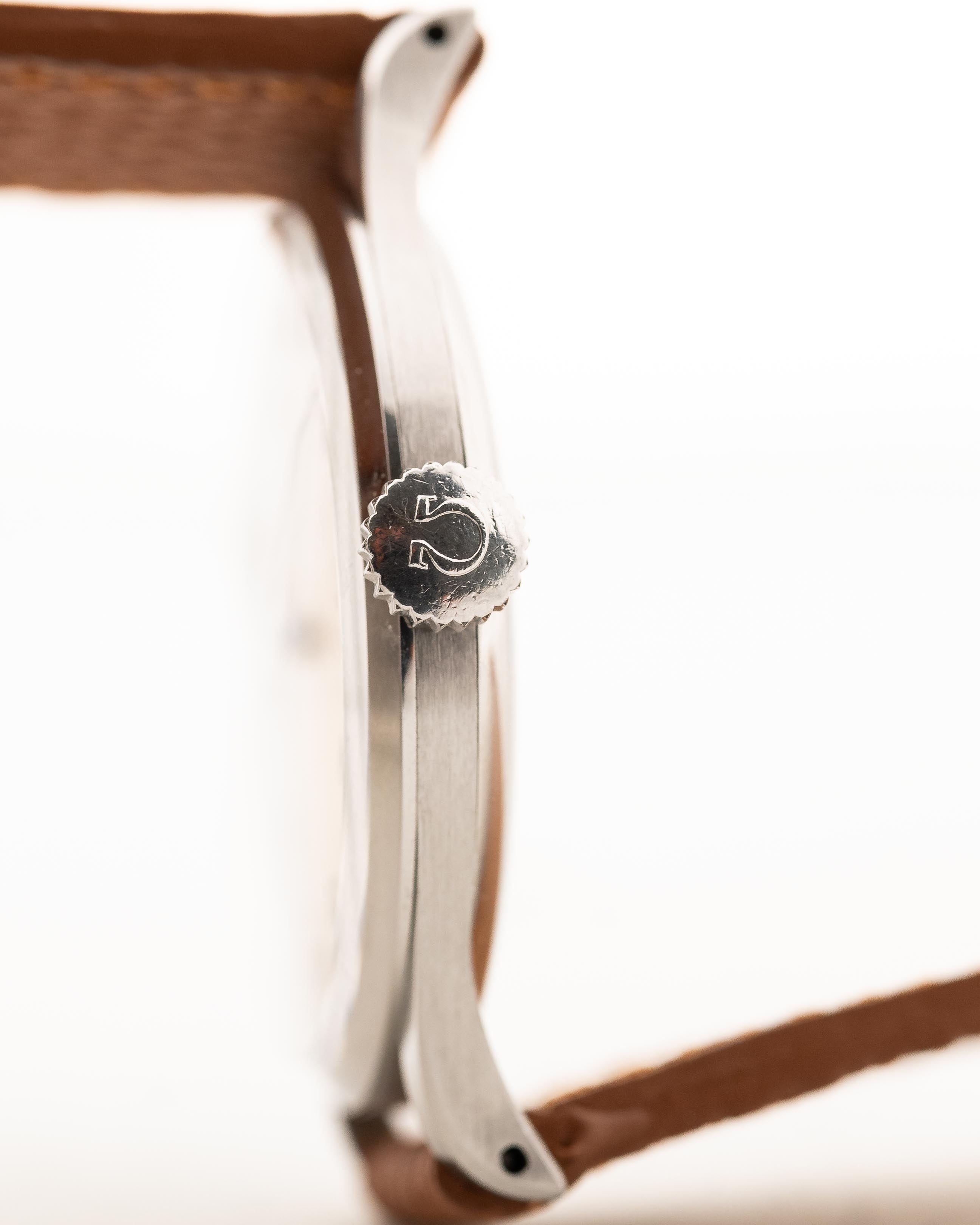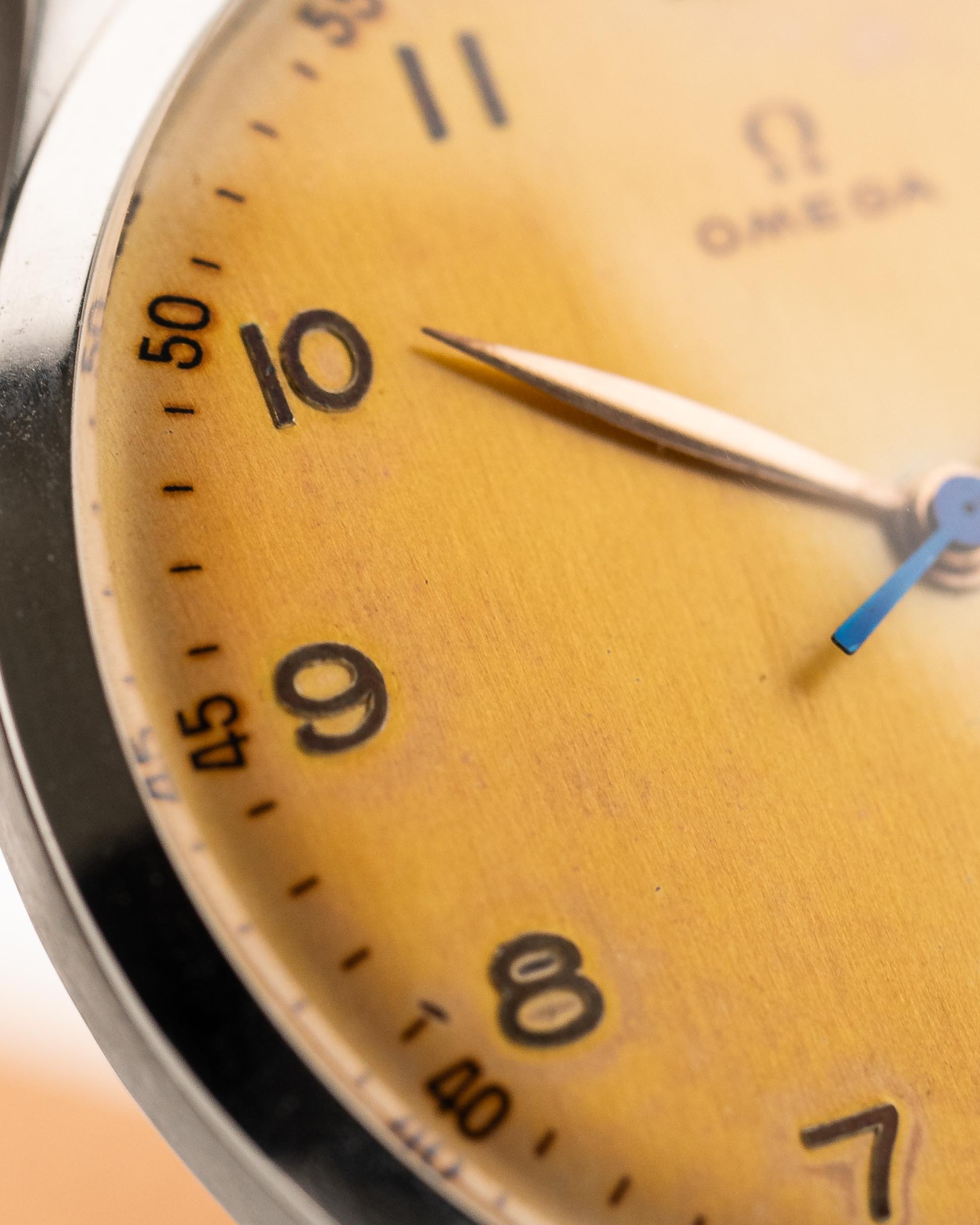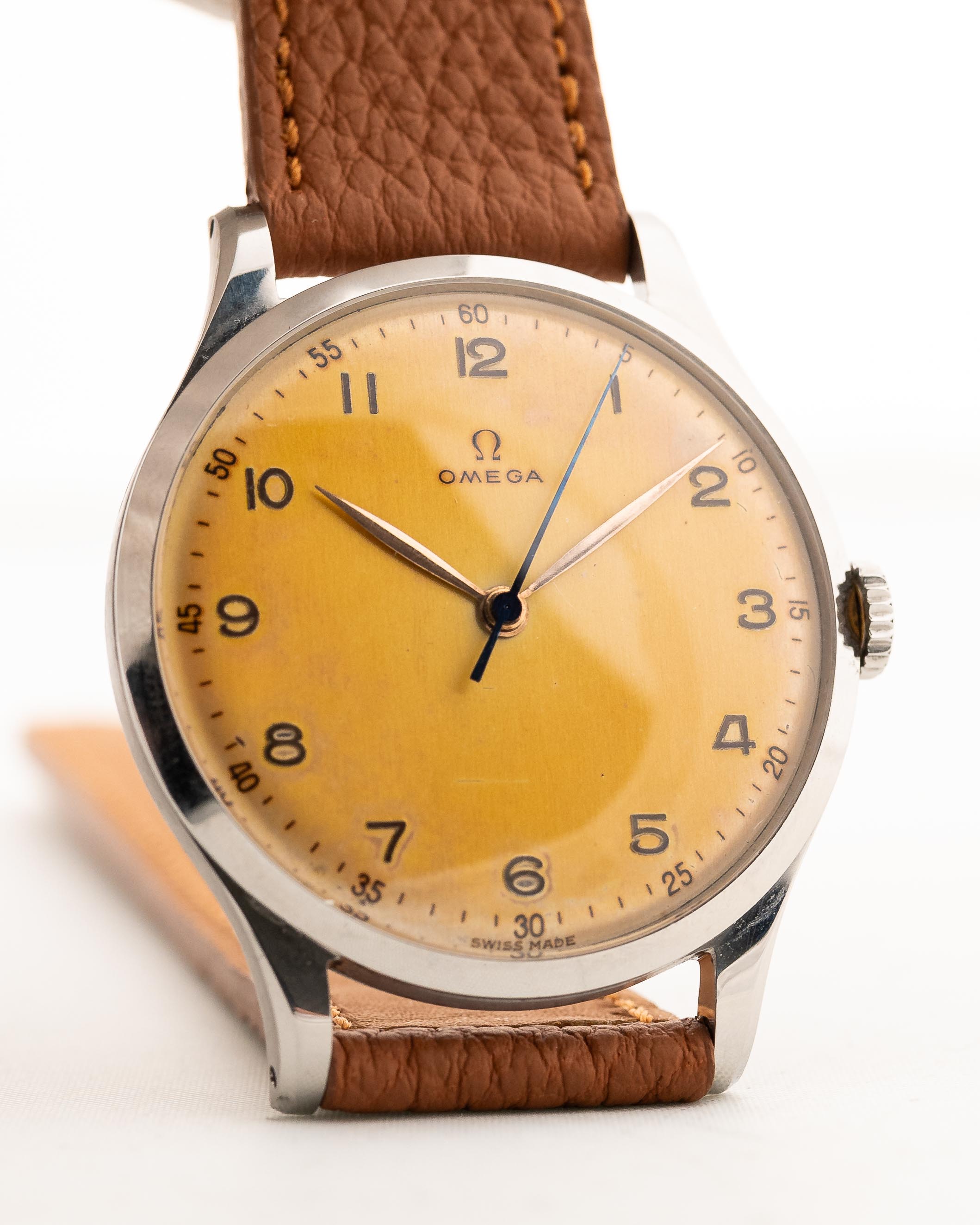 1940 年代是 Omega(歐米茄)的美好時光,這款美麗的正裝腕錶就是最好的例證。這款腕錶不僅美觀,而且實用。38 mm 的超大不銹鋼錶殼、向下傾斜的錶耳,以及華麗的蜜糖色錶盤,讓這款腕錶無與倫比。