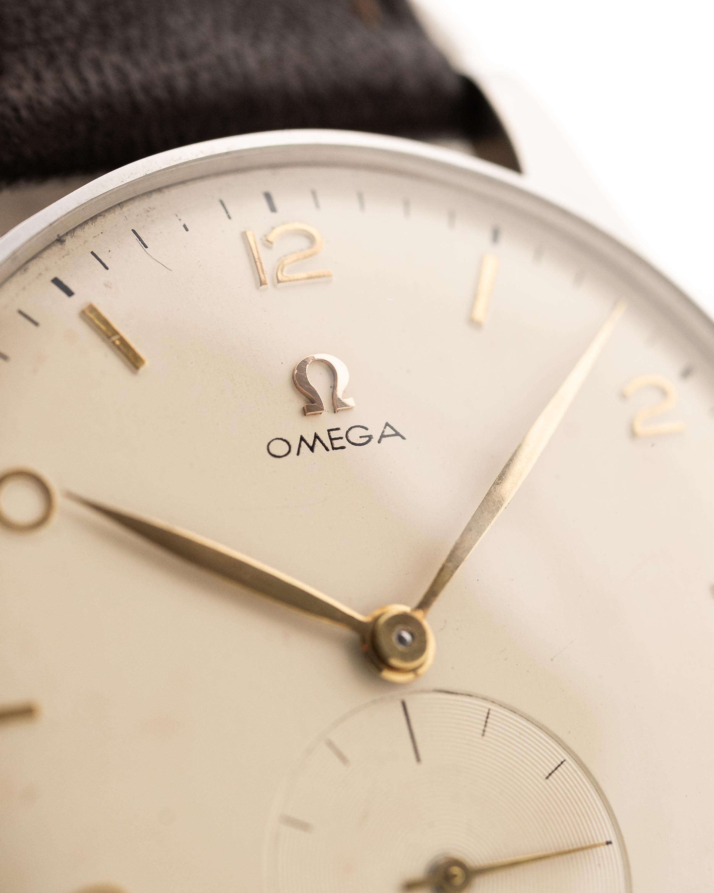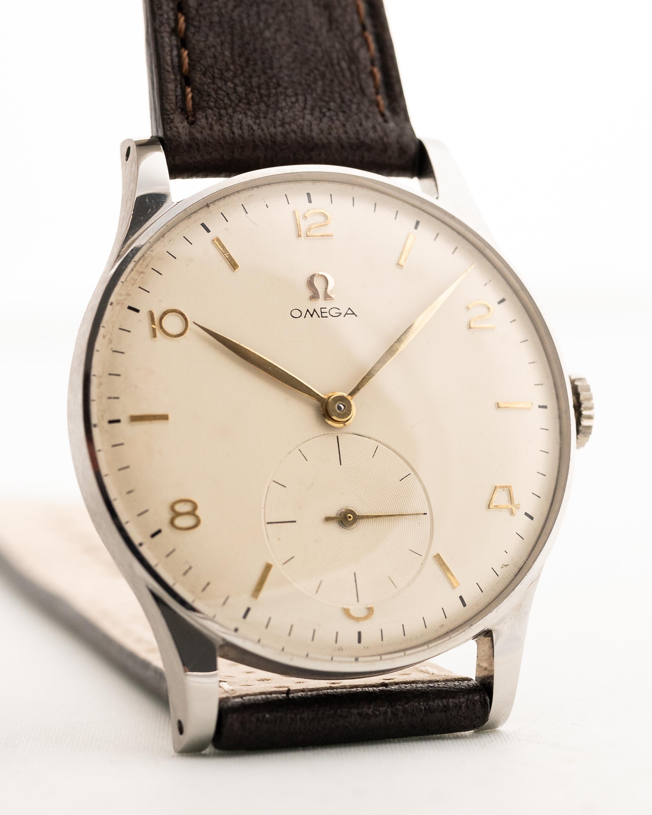 1940 年代是 Omega(歐米茄)的美好時光,這款美麗的正裝腕錶就是最好的例證。這款腕錶不僅美觀,而且實用。37.5 mm 的超大不銹鋼錶殼、向下傾斜的錶耳以及華麗乾淨的白色錶盤,讓這款腕錶無與倫比。