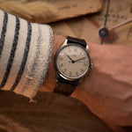 在當今尋覓一枚保存如此完好的巨型歐米茄腕錶已屬罕見——若能覓得仍附有1939年原廠歐米茄吊牌的錶款,實屬非凡珍品。此錶維持著極佳的真實狀態,錶盤保存精美,錶殼比例清晰俐落。