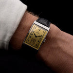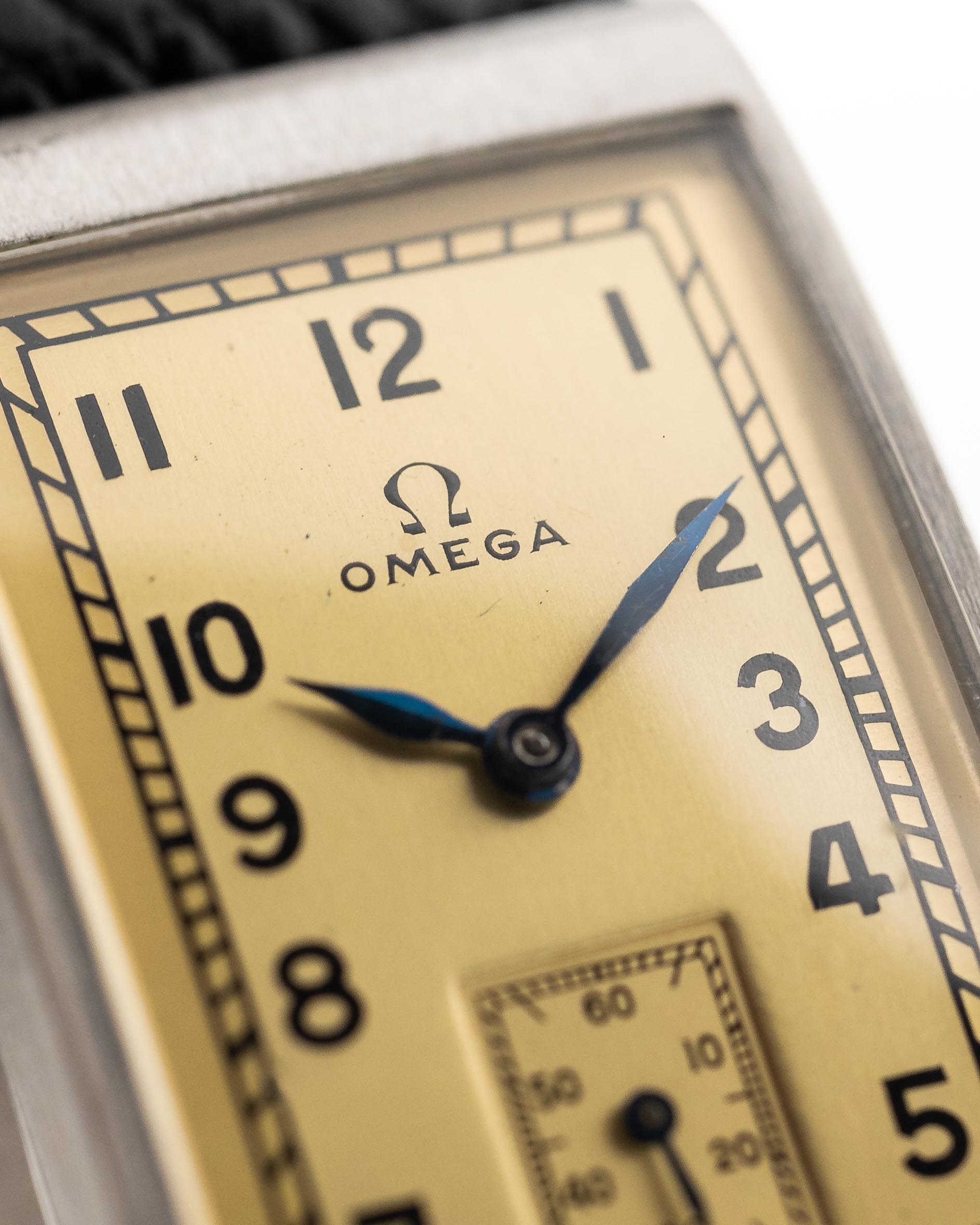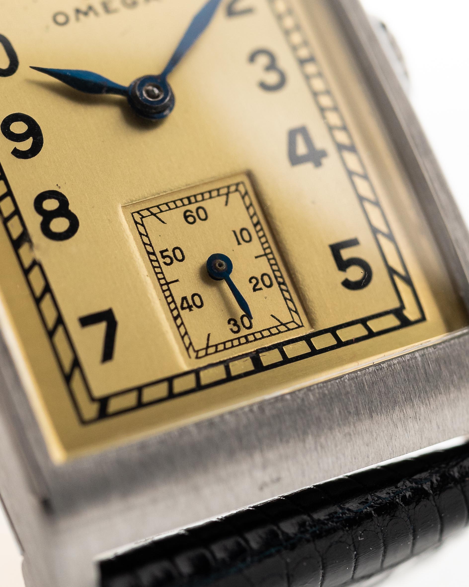 這並不是我們愛上的第一款 Omega Art Deco Dress Watch。這款腕錶採用長方形精鋼錶殼,藍鋼葉形指針、金色錶盤搭配裝飾藝術風格阿拉伯數字和輔助秒針,使其更具吸引力。