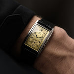 這並不是我們愛上的第一款 Omega Art Deco Dress Watch。這款腕錶擁有巨大的長方形精鋼錶殼,華麗的金色錶盤搭配裝飾藝術風格的阿拉伯數字、輔助秒針和獨一無二的藍色指針,使其更具吸引力。最令人驚艷的是它近乎完美的狀態!