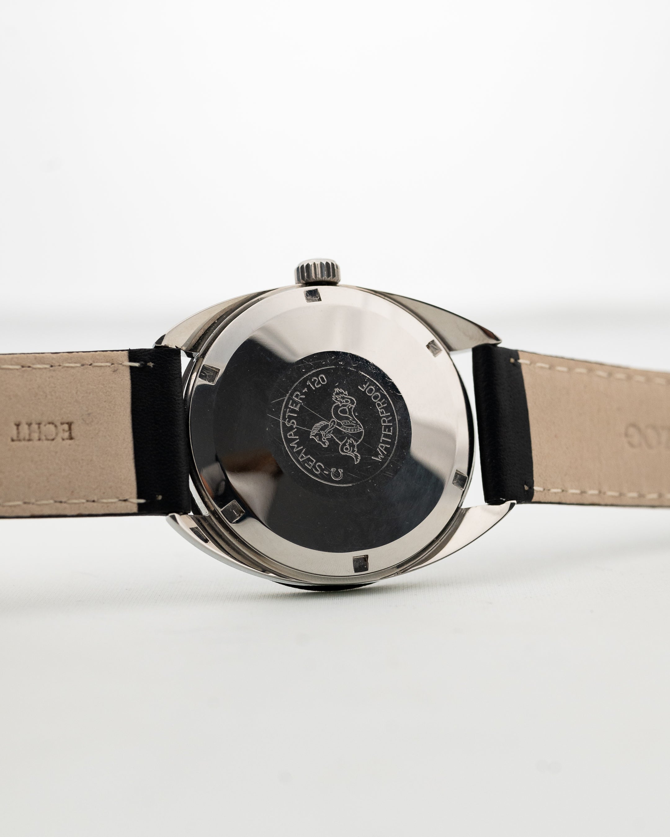 在此您可以看到 Omega 於 1967 年製造的海馬 120。35.5 mm 精鋼錶殼搭配美麗的啞光黑色錶盤,完美無瑕。