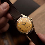 這款Omega Seamaster Ref.2990-1來自 1958 年,結合了中世紀永恆的優雅與罕見的錶盤紋理和存在感。36 毫米鍍金錶殼在那個時代顯得較大,其簡潔的比例和微微下墮的錶耳更顯優雅。