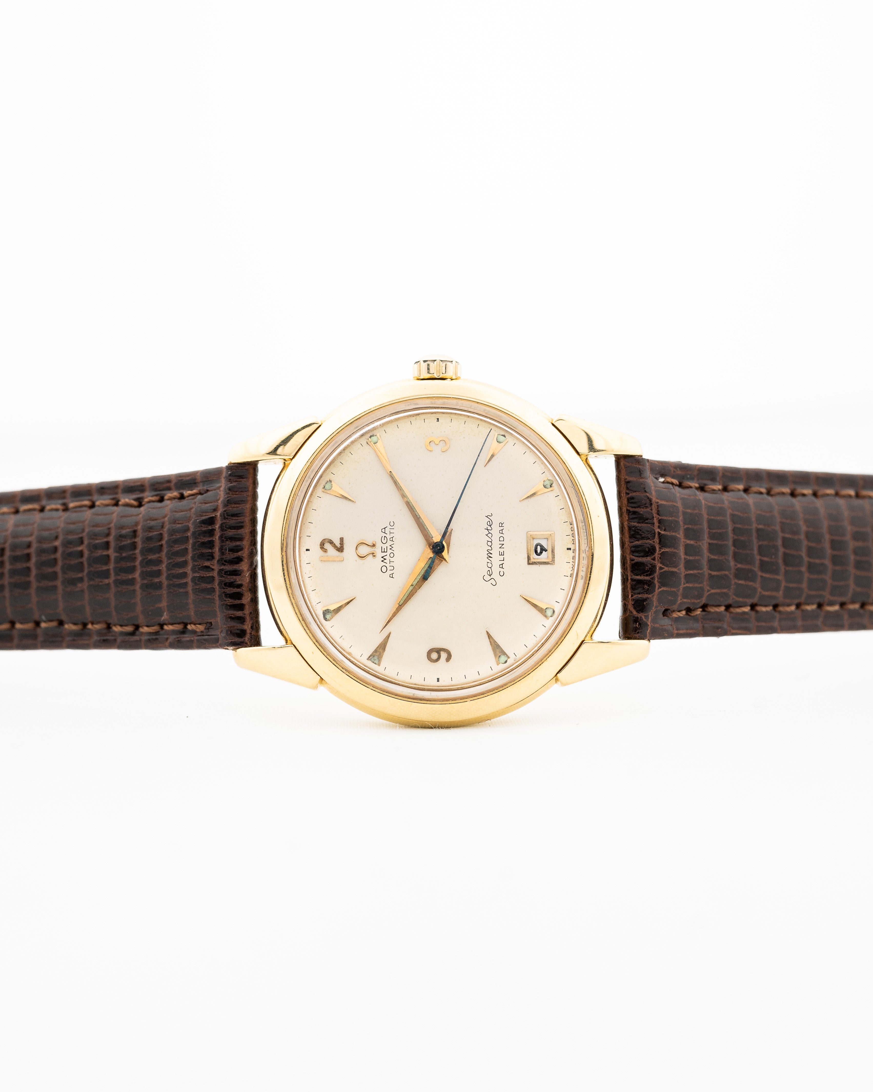在此,您可以看到 Omega 於 1952 年製造的海馬腕表,這款腕表令人著迷,而且非常罕見。它的特色是 35 mm 18K 黃金錶殼和非常漂亮的厚錶耳。