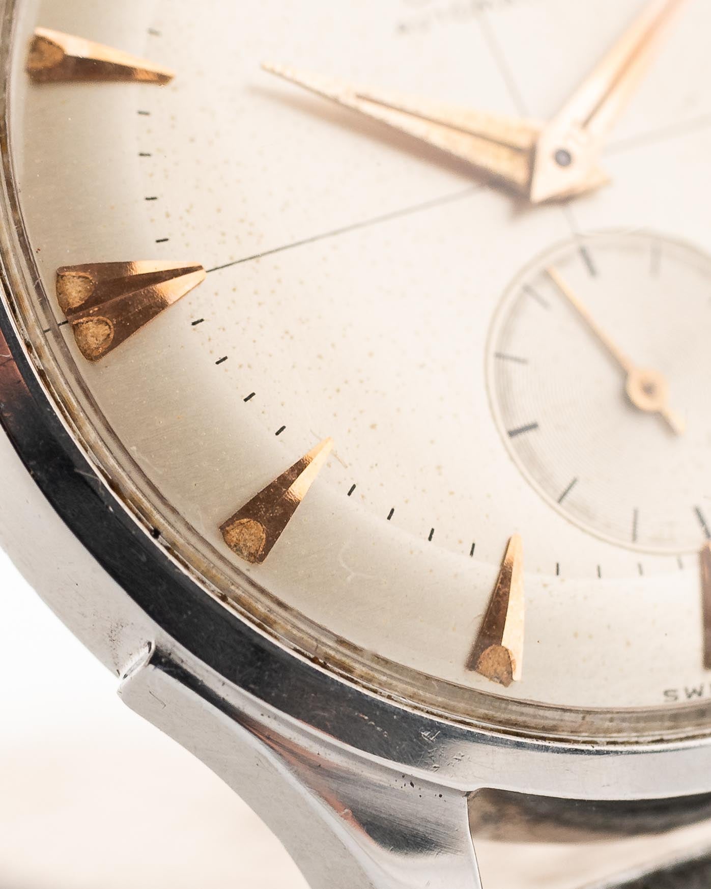 雙色光學錶盤、玫瑰色指針和箭頭時標保存完好,而附屬秒錶盤則進一步提升了這款腕錶的品味。這款腕錶狀態極佳,錶殼光潔鮮明。