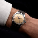 這款美麗的腕錶採用銳利的不銹鋼錶殼設計,搭配 1943 年的夢幻錶盤配置,錶徑 30.5 mm,恰到好處的低調。