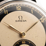 另一枚罕見的1940年代歐米茄珍品,保存狀態極佳。銀黑雙色「燕尾服」錶盤採用 阿拉伯數字時標、鐵路式分鐘刻度環,搭配優雅的金色注射器指針——完美展現早期歐米茄設計的絕妙平衡美感。