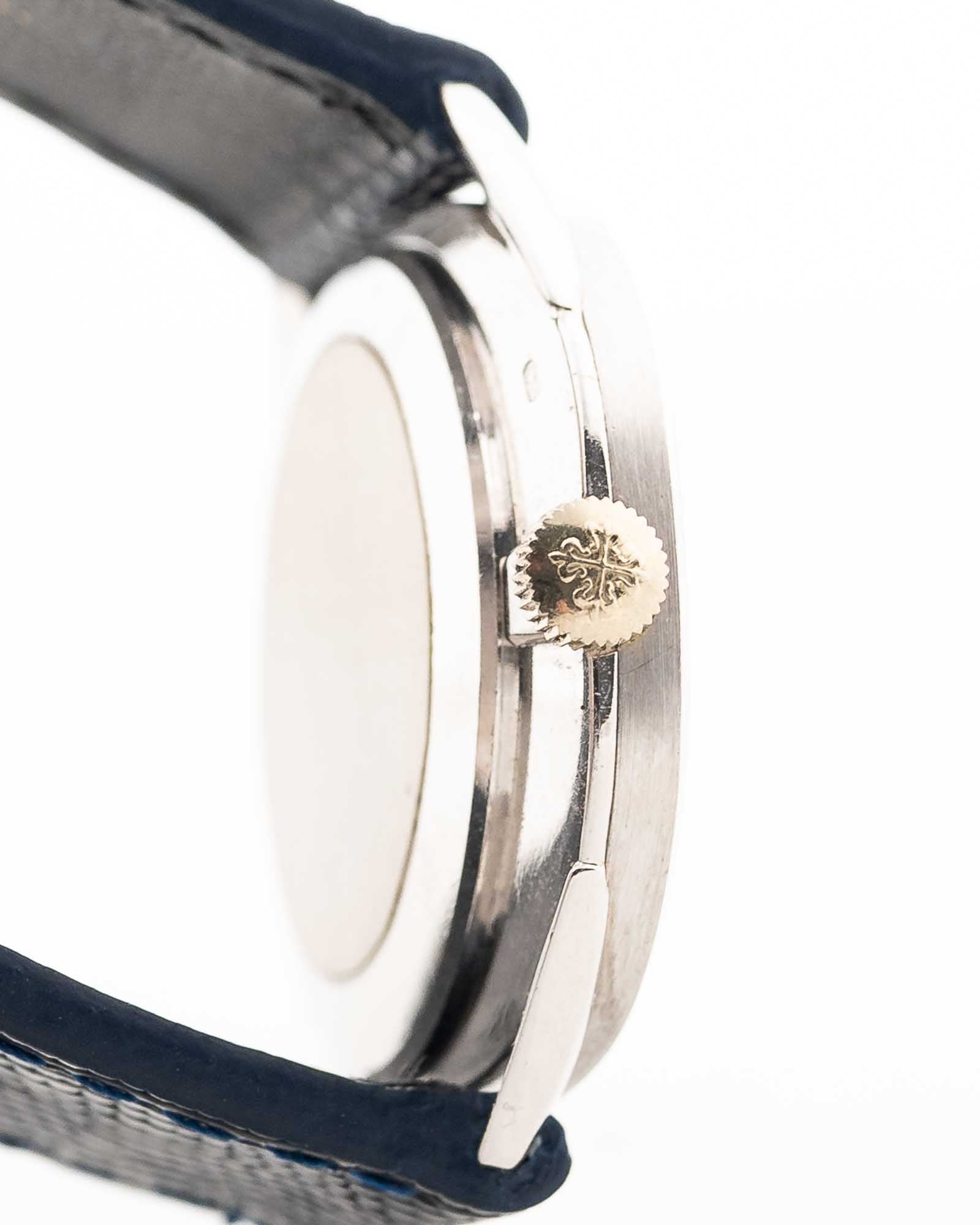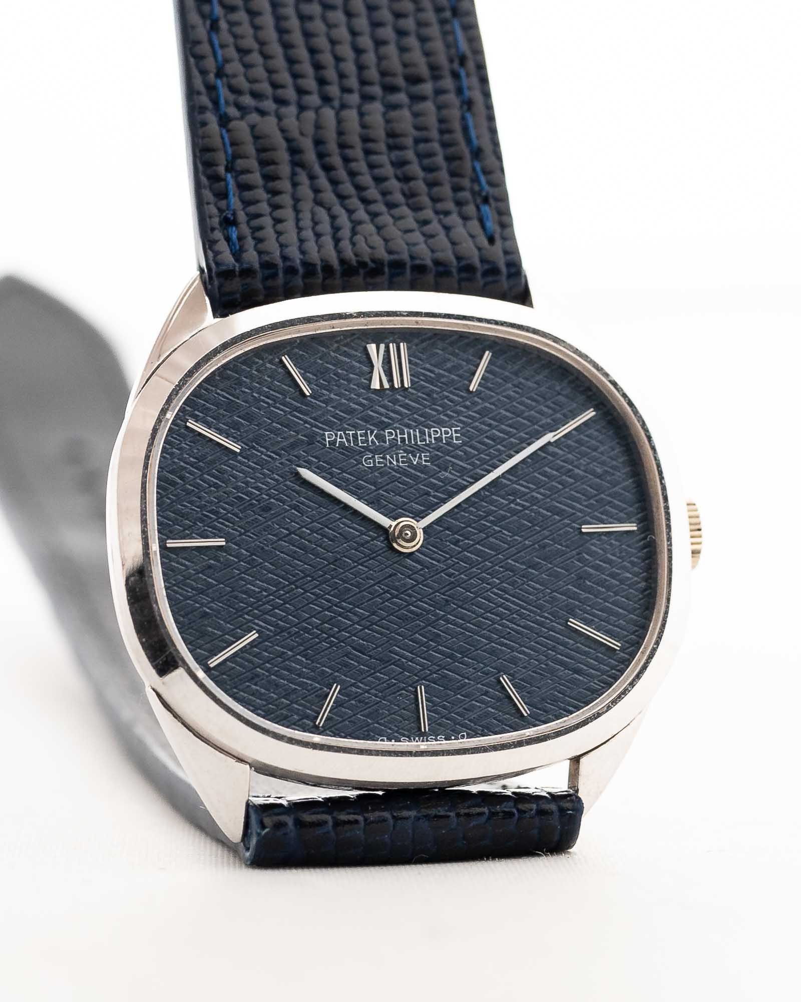 百達翡麗橢圓腕錶以圓形與方形之間完美平衡的設計,長期被譽為比例藝術的典範之作。這款1970年代的Ref. 3545型號,完美詮釋了此系列的建築美學精髓——18K白金錶殼與精緻的藍色槓式紋Sigma錶盤相得益彰,散發著低調而耀眼的光輝。