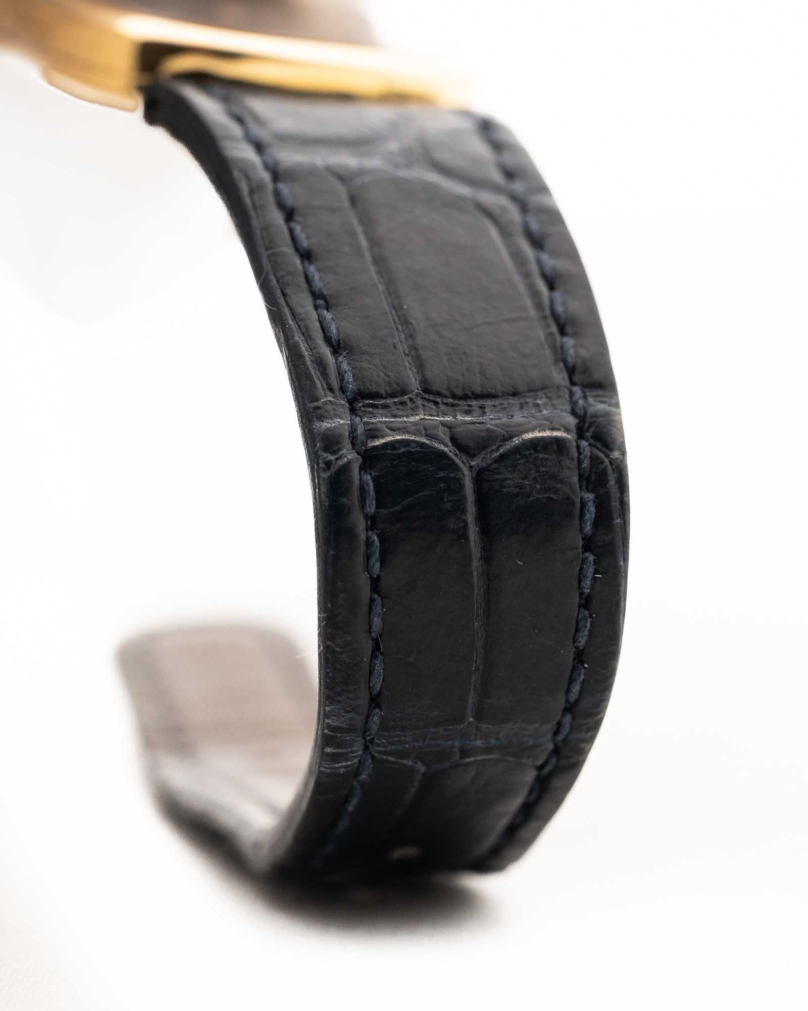 這款1980年代的 Ref. 3788J腕錶保存狀態極佳,採用纖薄的18K黃金錶殼,內蘊無瑕的藍色太陽放射紋西格瑪錶盤。搭配原裝百達翡麗皮革錶帶 與18K金錶扣,佩戴於腕間仍能展現純粹而精緻的氣韻。