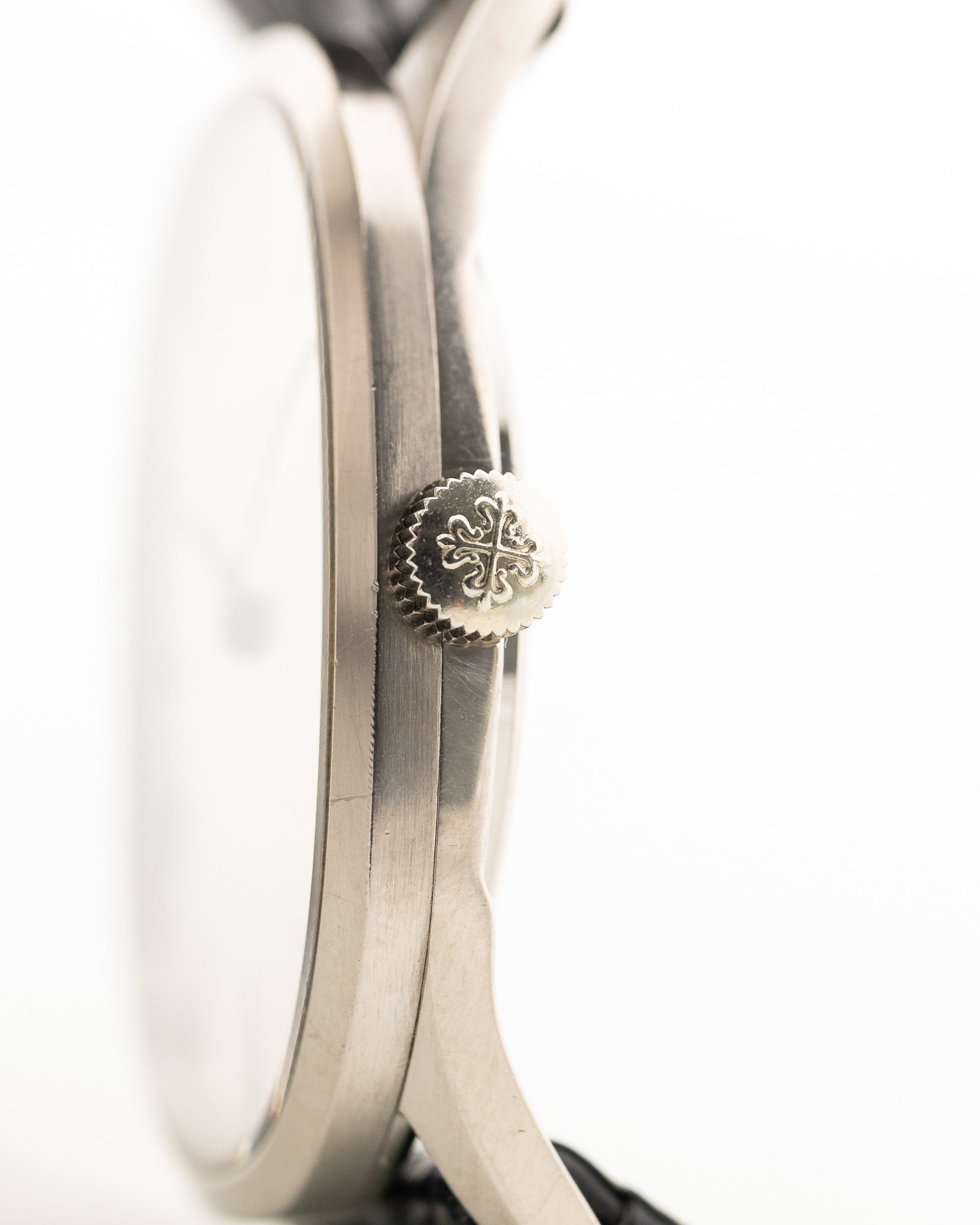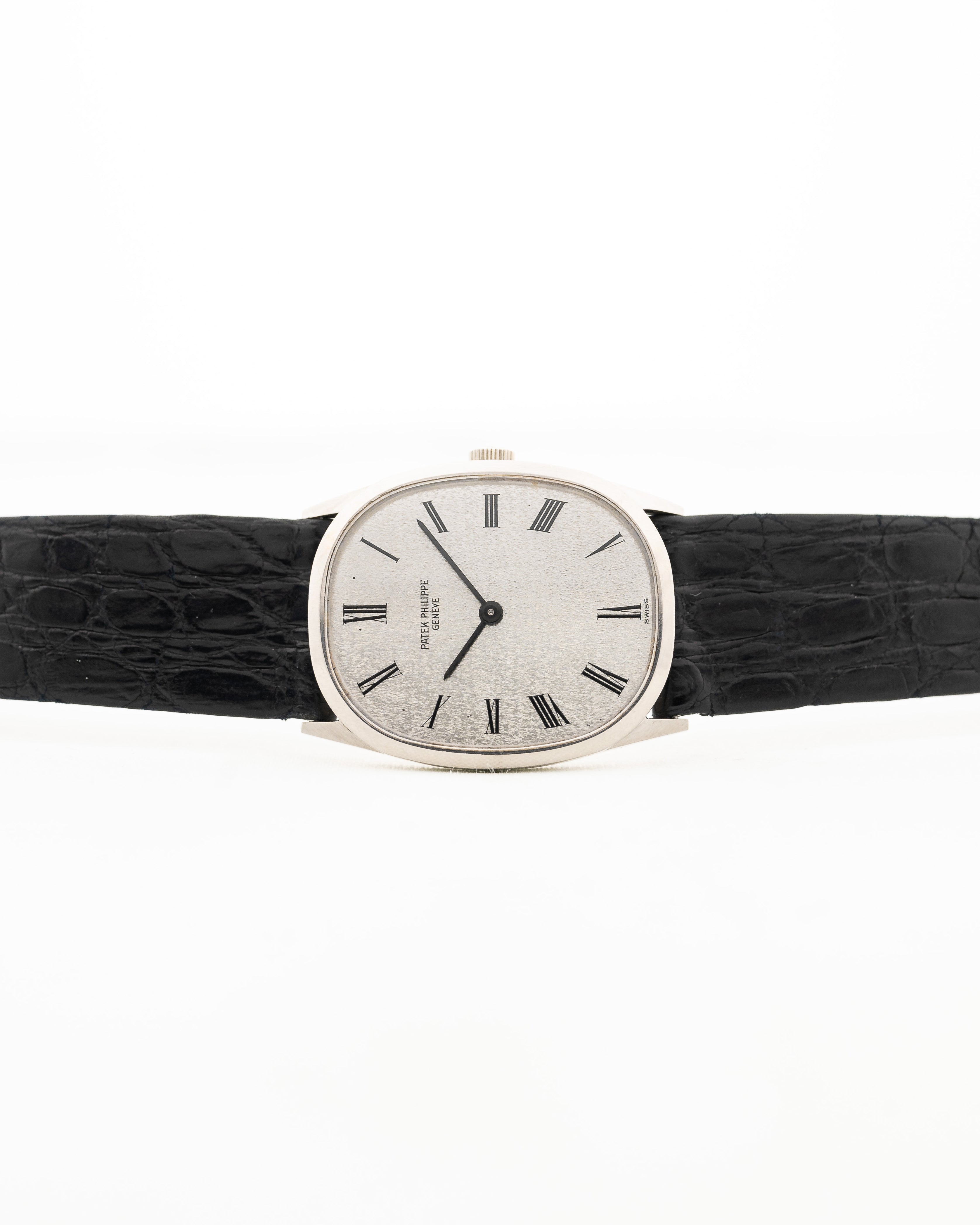 這款百達翡麗 Ellipse 正裝腕錶是百達翡麗的傑出代表作。這款 3548 / 1 型腕錶擁有 18K 白金錶殼和非常罕見的磨砂銀色錶盤,錶盤狀態極佳,並配備了相匹配的羅馬數字。