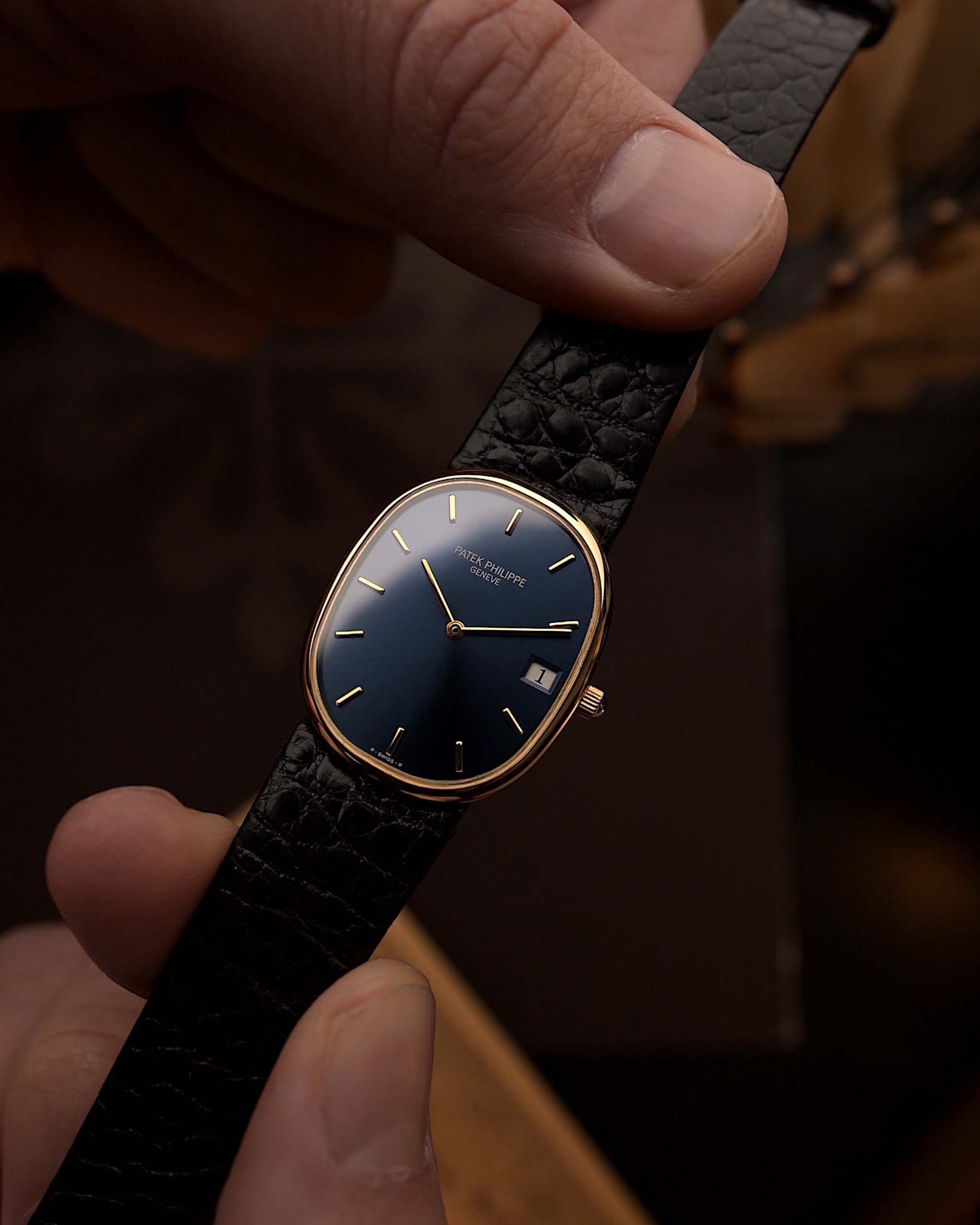 百達翡麗 3788J 金質橢圓腕錶 — 藍粼粼日暈優雅款(1980年代)