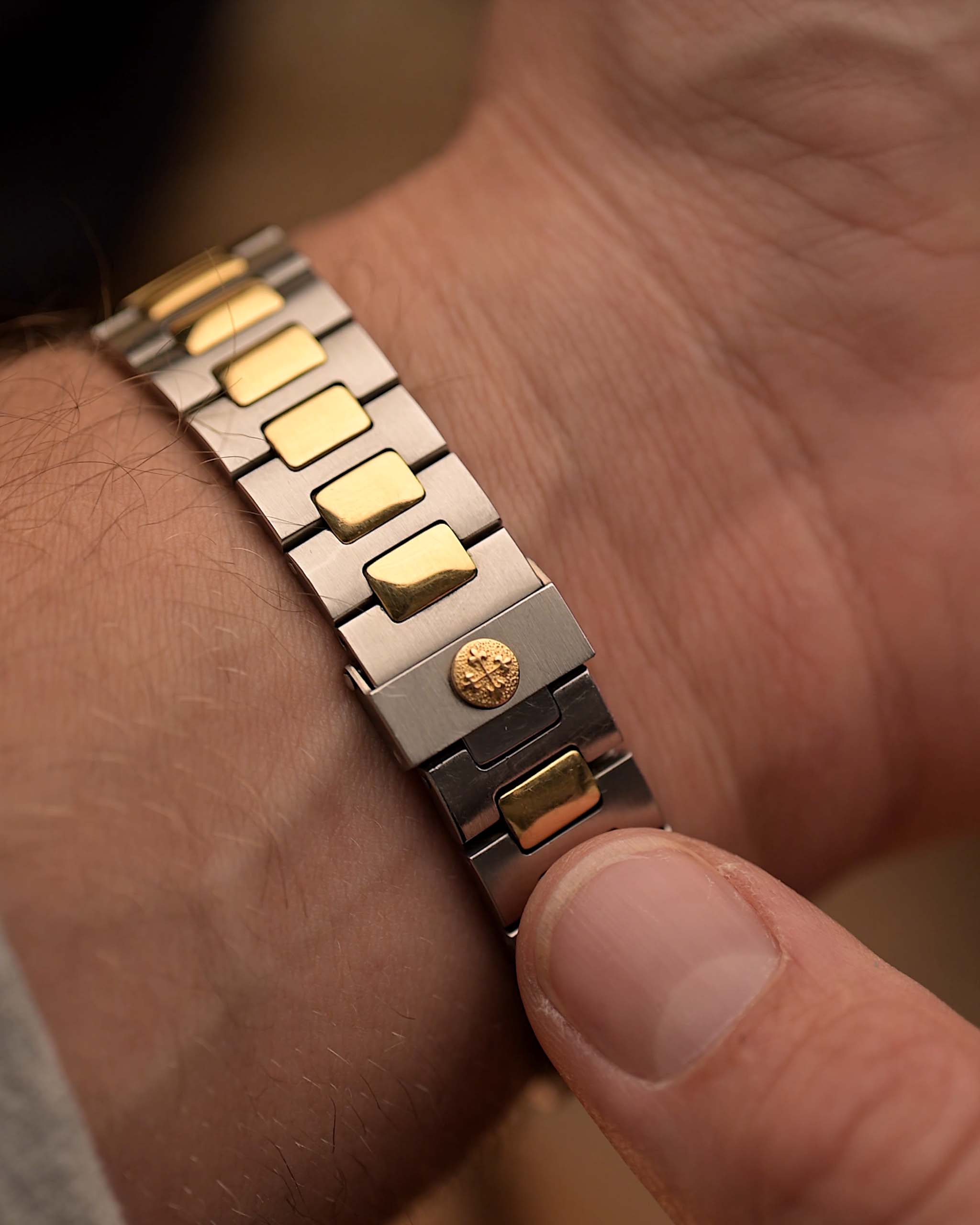 這款腕錶以罕見的不銹鋼與 18K 黃金雙色結構傲視同儕。金色稜紋的 sigma 表盤絲毫無損,搭配均勻老化的原色熒光,更添溫暖與個性。纖薄的 7.4 mm 外型、整合式錶鏈和單體錶殼結構,讓這款 Nautilus 腕錶格外舒適,視覺上也十分和諧。