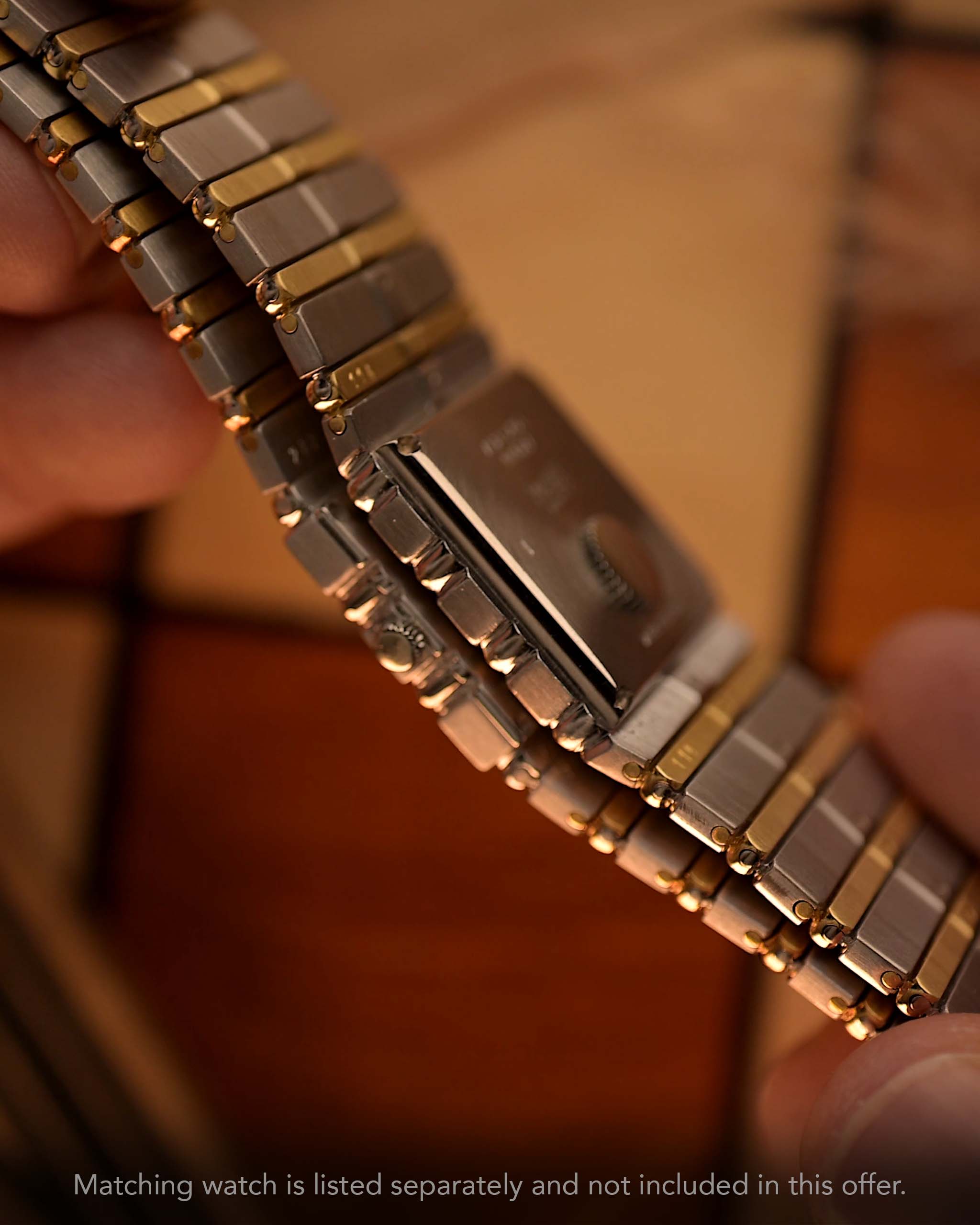 其無縫鑲嵌的金質手鍊與雕塑感錶殼渾然一體,彰顯伯爵將珍貴材質與超薄工藝相融合的標誌性風格。優雅錶盤——完好無瑕且未經改動——捨棄數字刻度,讓雙色金材質成為視覺焦點。