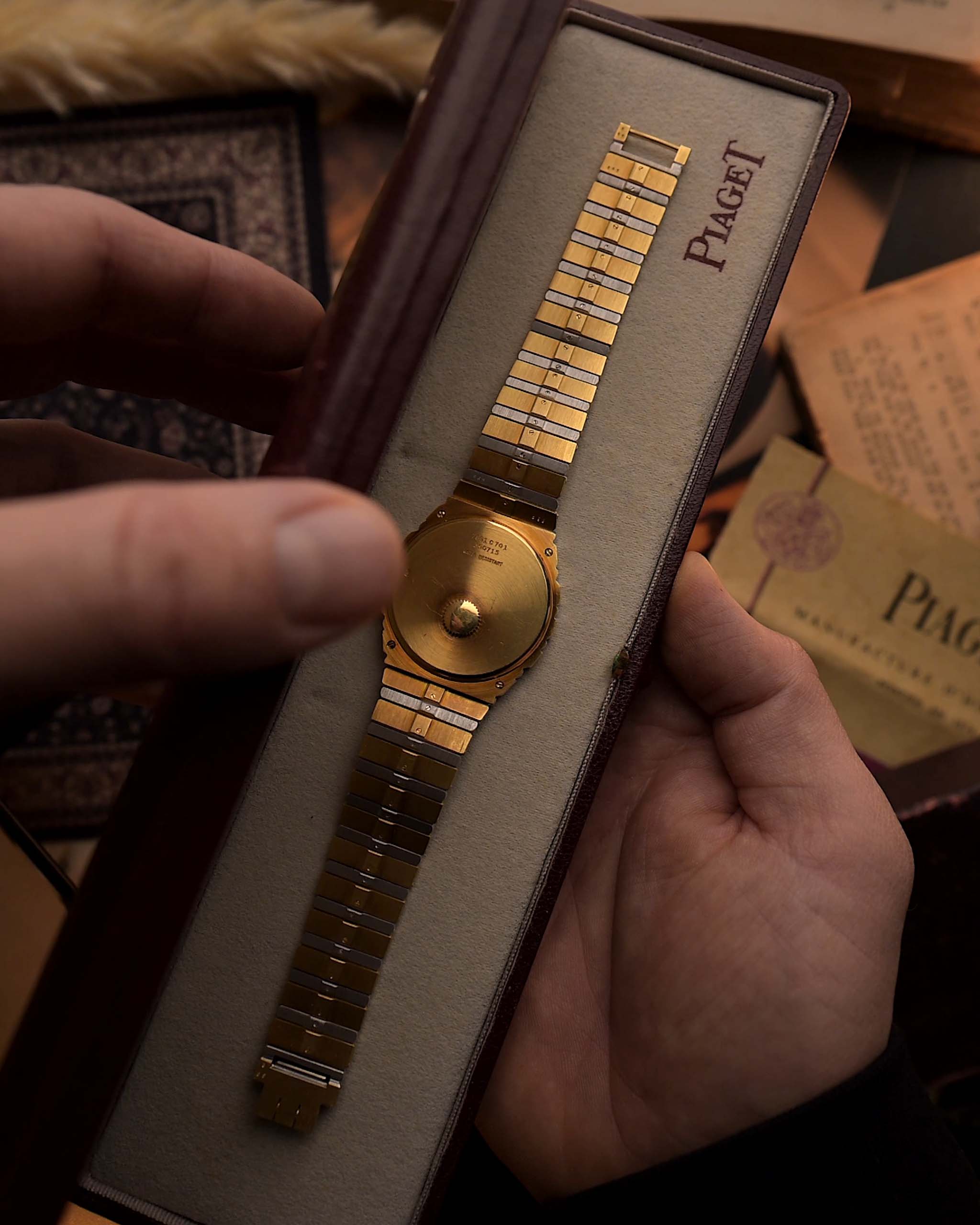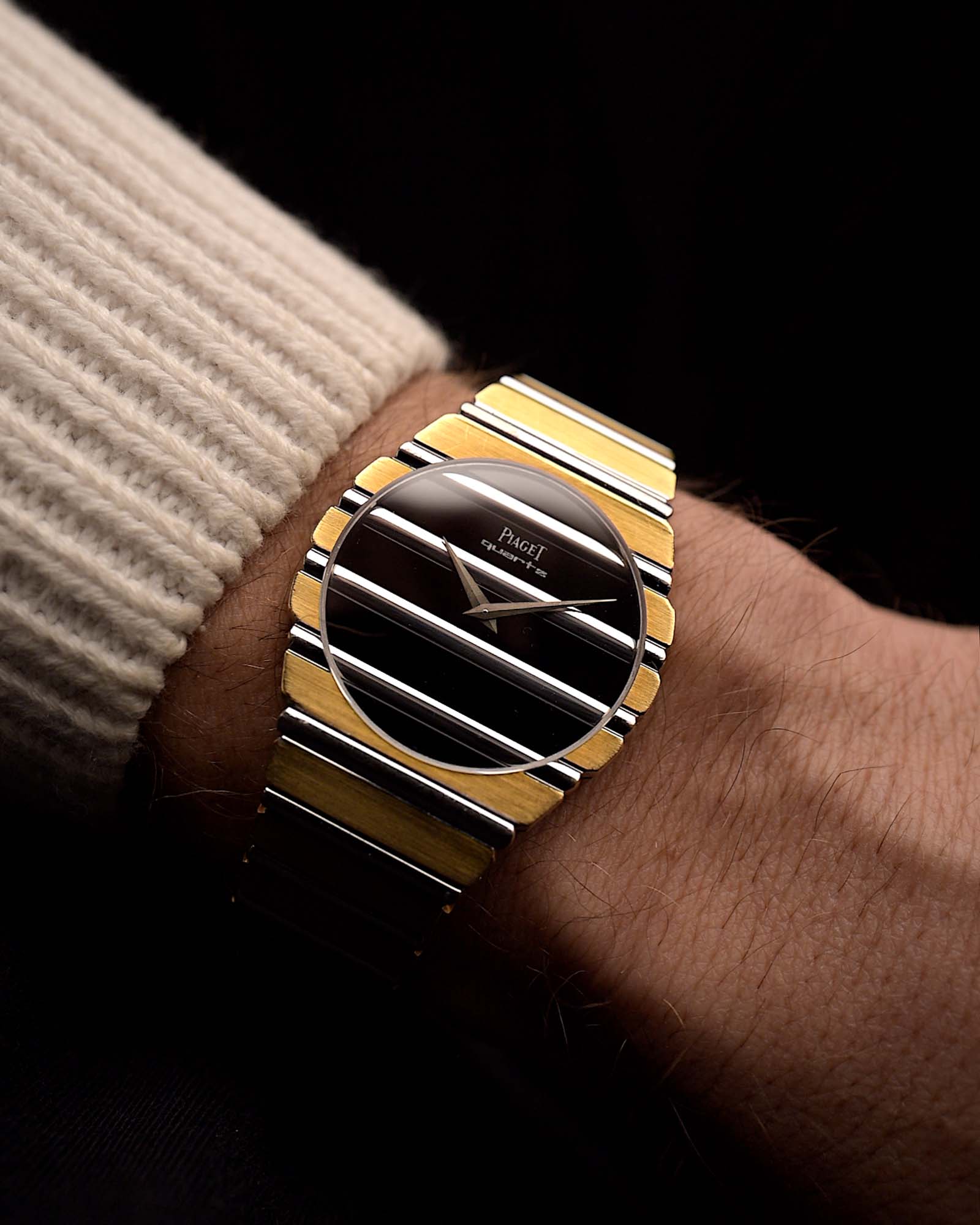 伯爵Polo系列型號7661 C 701腕錶,堪稱1980年代奢華美學的極致詮釋:34毫米巨型錶款以18K黃金與白金打造,搭配無瑕瑪瑙石錶盤,更添層次豐富的華美氣——縱使在Polo系列中亦屬罕見。