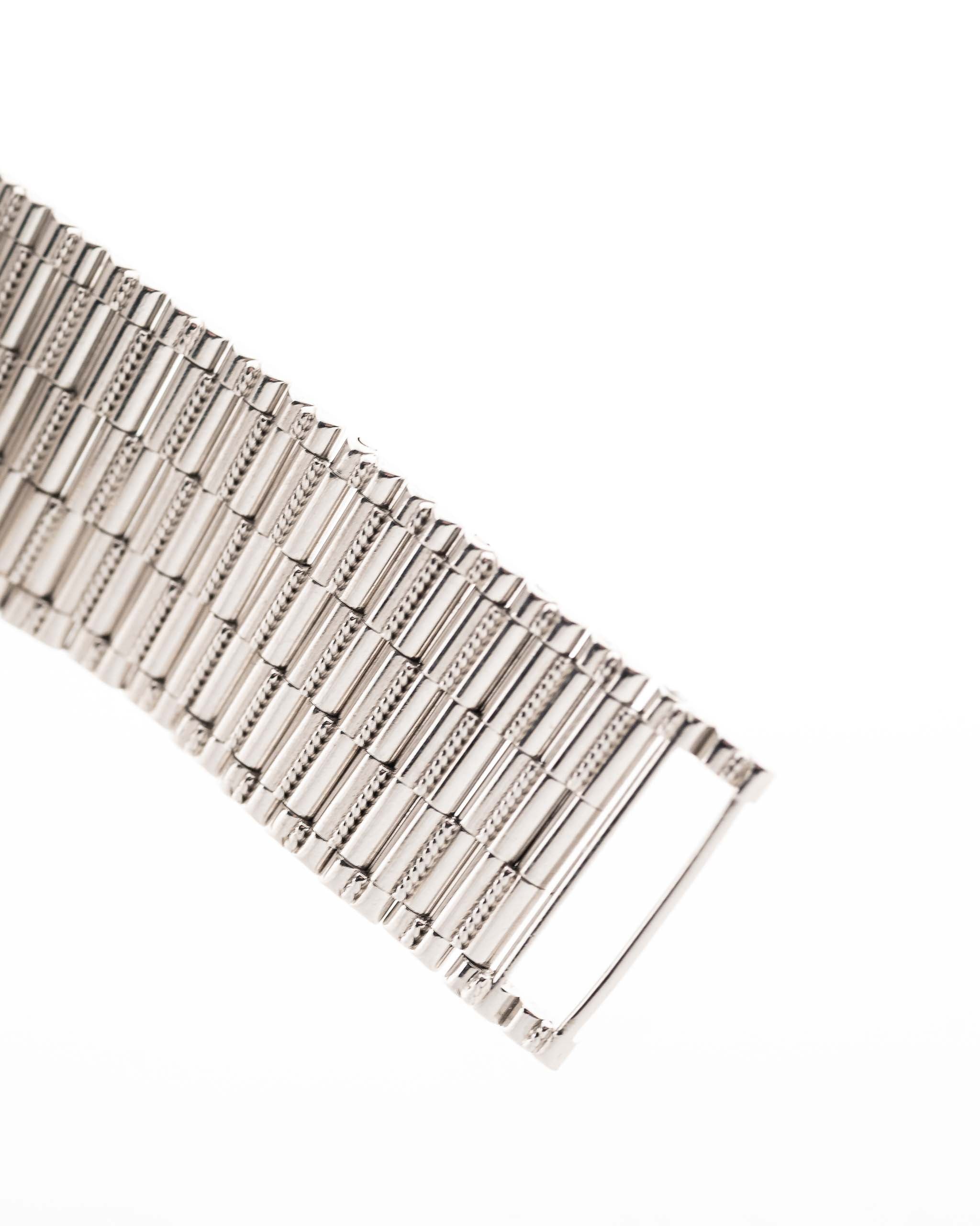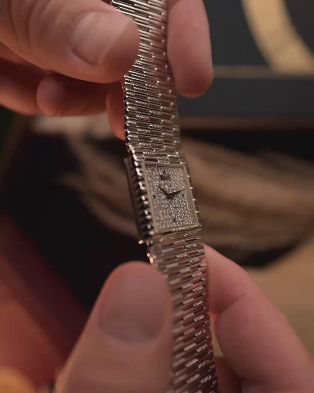 這款罕見的 Ref.80131 G2採用簡潔的幾何線條、完全整合的 18K 白金錶鏈,以及綴有四顆藍寶石的眩目工廠密鑲鑽石錶盤。這款腕錶既是高級珠寶創作,也是 1980 年代的設計標誌。