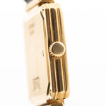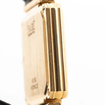 1980 年代的古董 Piaget Polo 8193 Rectangular 腕錶特寫照片。18K 黃金錶殼,20 毫米,配石英機芯、原裝金色錶盤、原裝真皮錶帶和 18K 金錶扣。