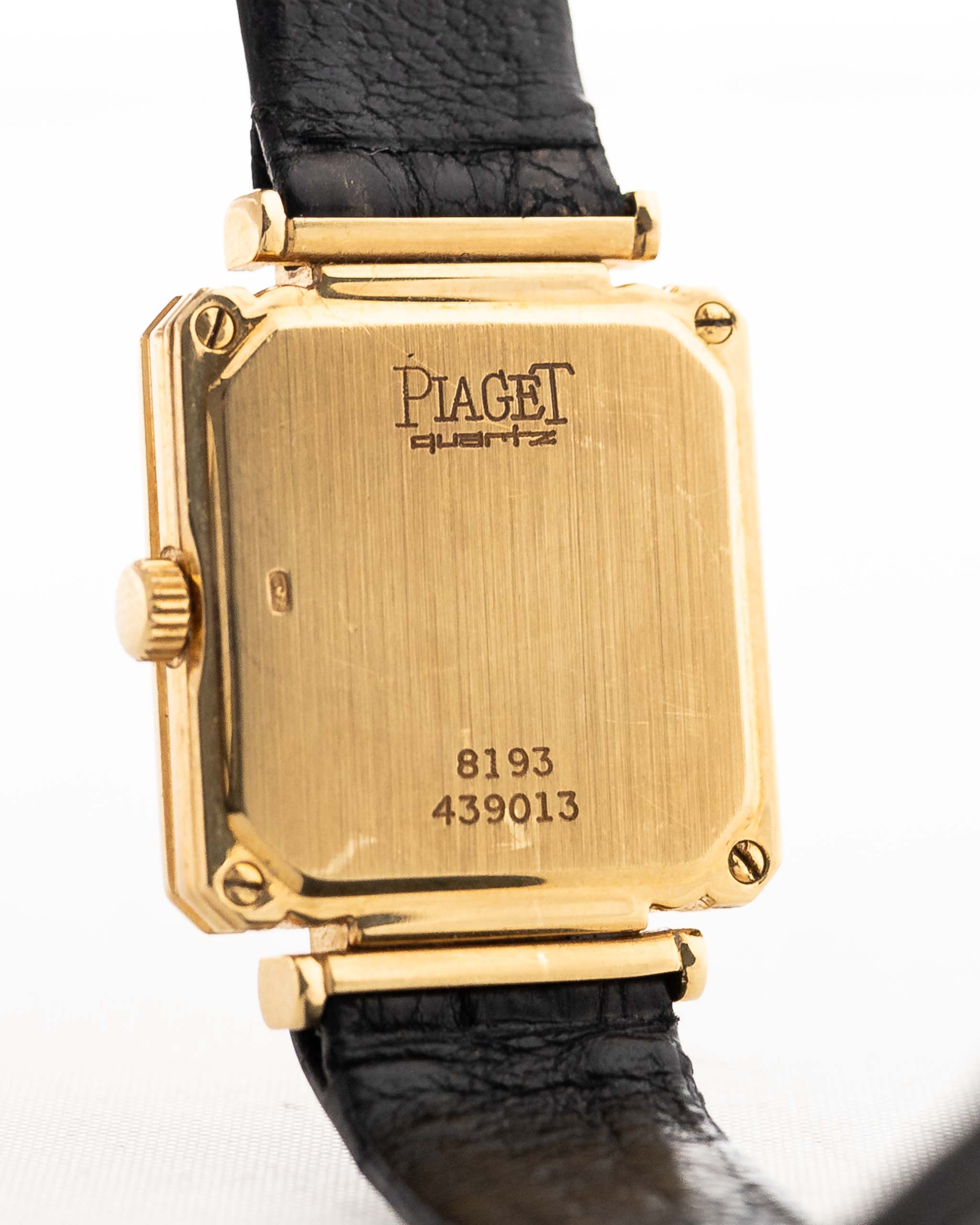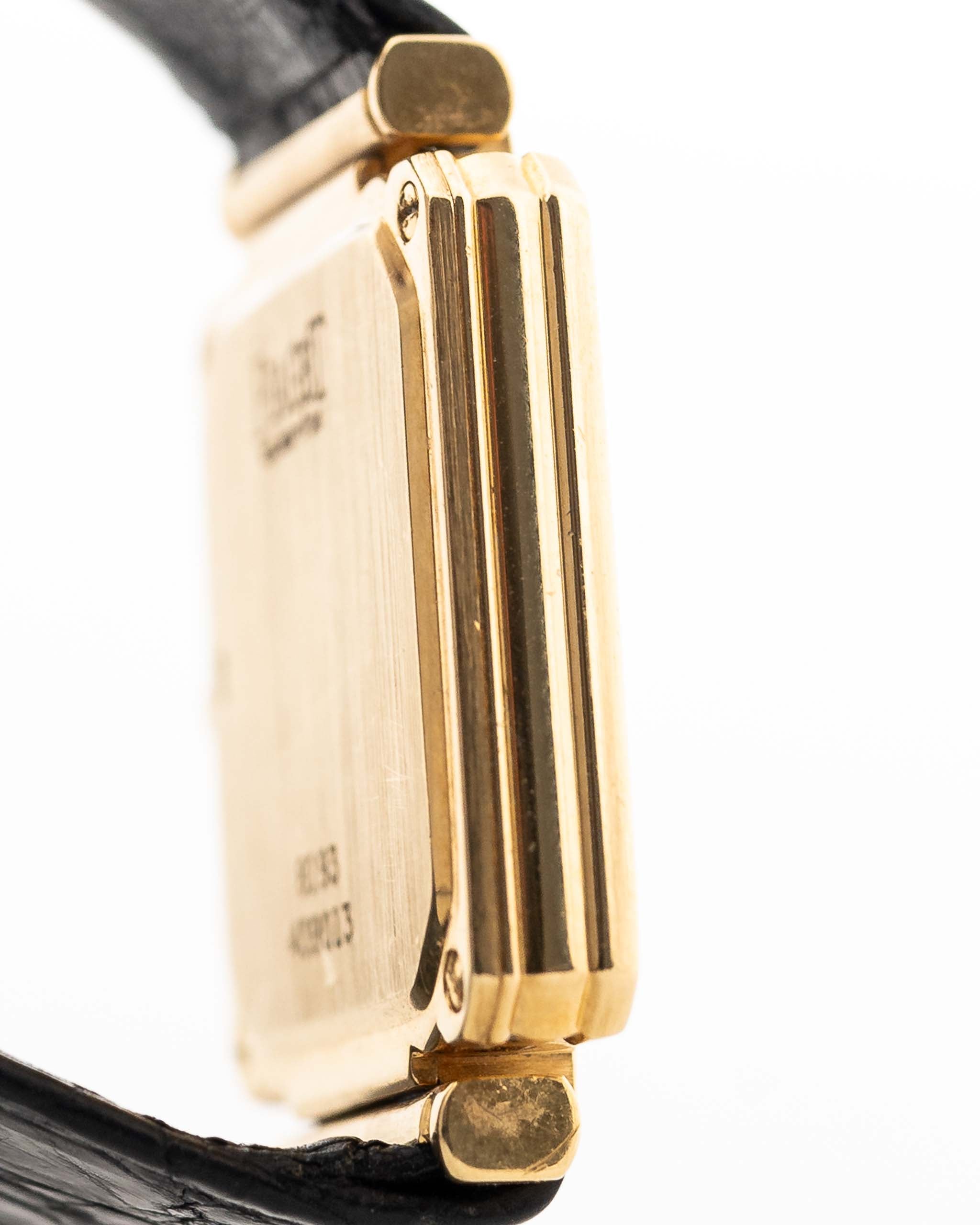 1980 年代的 Piaget Polo 8193 Rectangular 腕錶照片。18K 黃金錶殼,20 毫米,配石英機芯、原裝金色錶盤、原裝真皮錶帶和 18K 金錶扣。