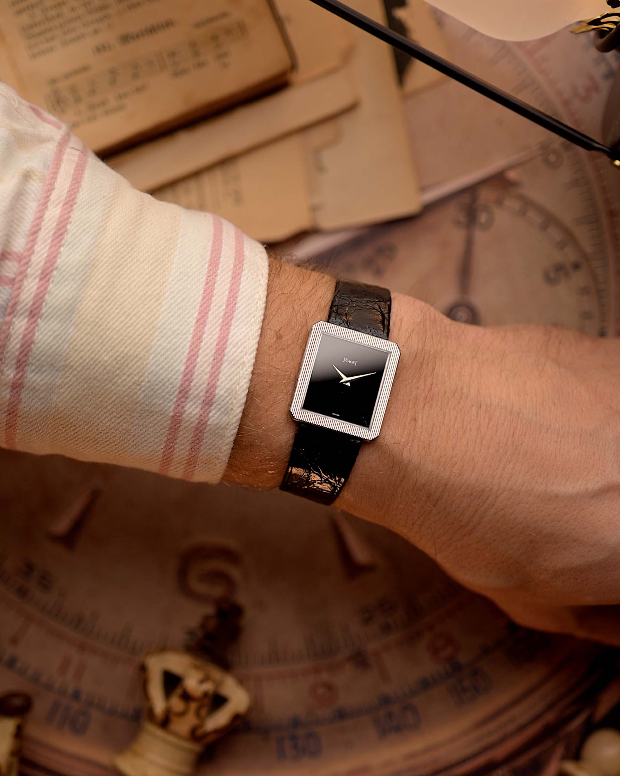這款腕錶搭載劃時代的9P機芯,是當時最薄的手動上鏈機芯,讓伯爵得以嘗試使用奇異的石質錶盤,同時保持超薄的輪廓。厚度僅有5毫米,佩戴起來就像精緻的珠寶,但卻具有機械的靈魂。