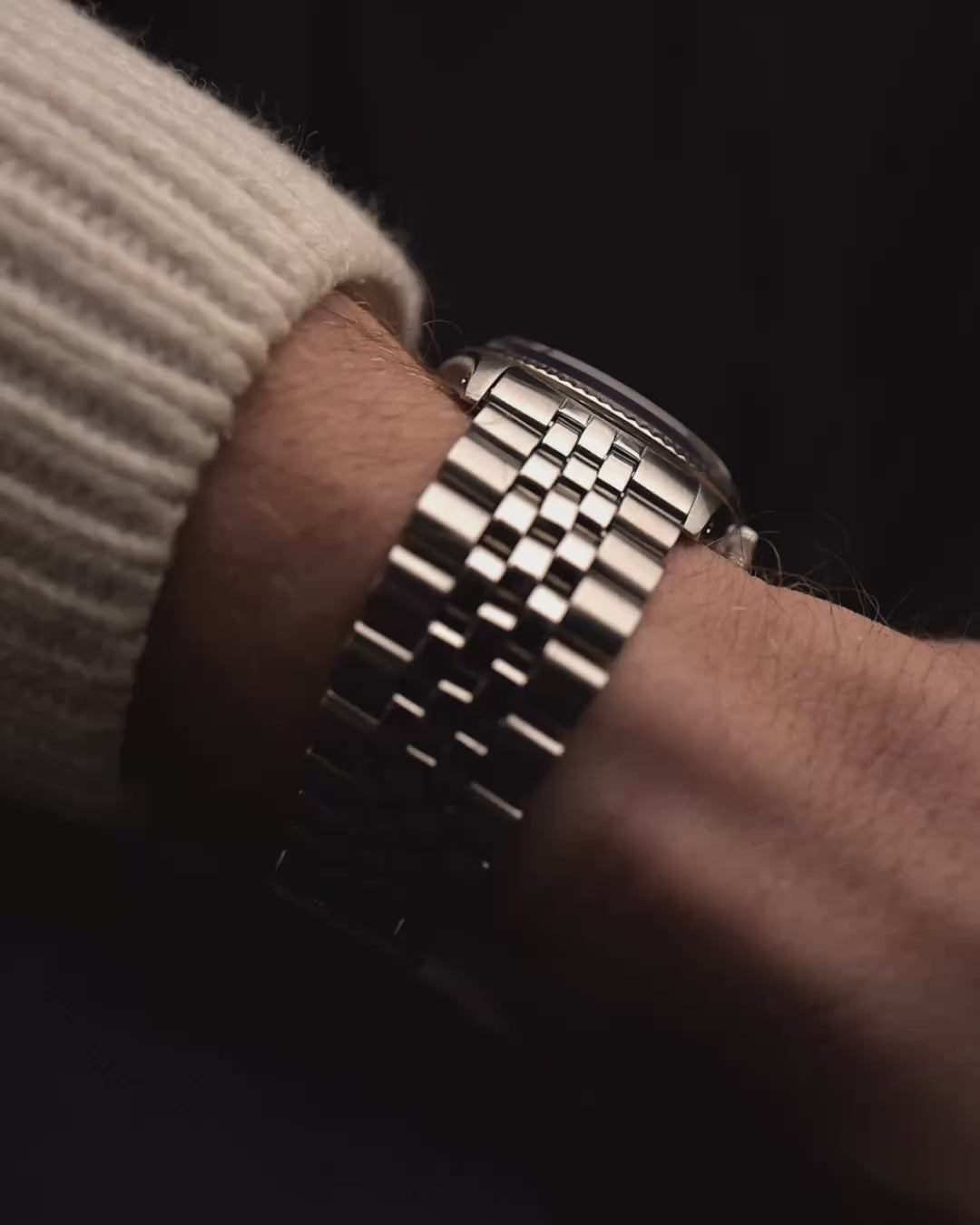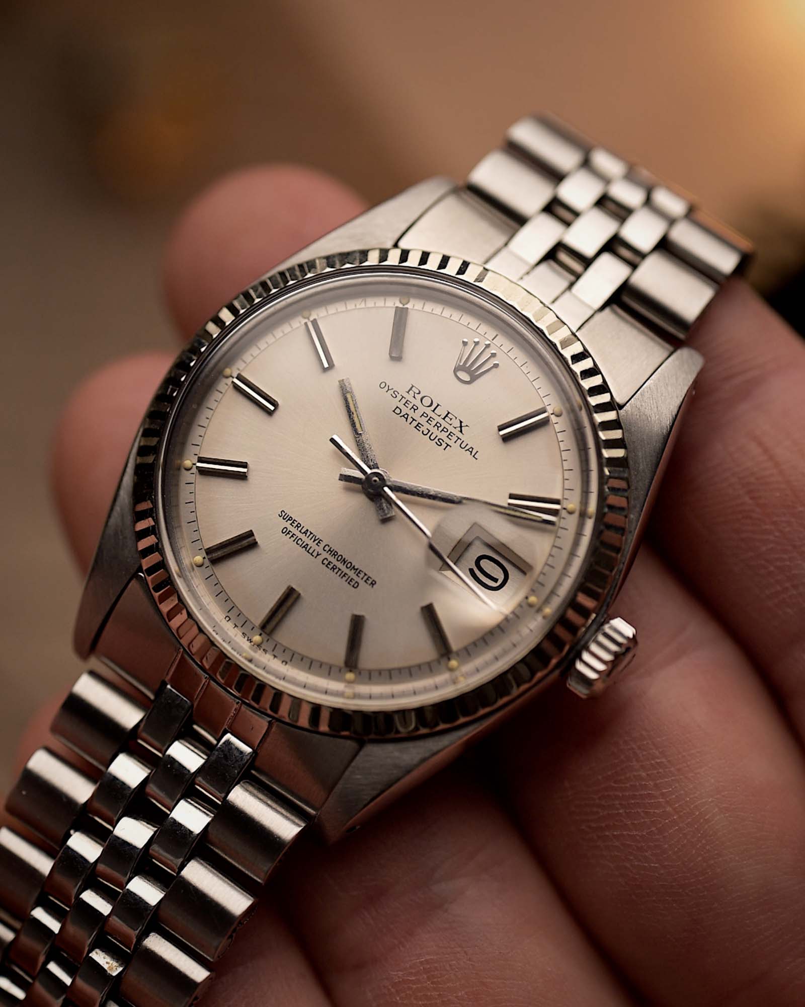 這款1973年的Ref. 1973 年的1601完美體現了這種精神。其36 mm 不銹鋼蠔式錶殼、凹槽白金錶圈和銀色太陽紋錶盤 創造出外形與功能的和諧平衡。時標、指針和熒光都歷經歲月的洗禮,賦予這款腕錶低調的復古魅力,佩戴起來毫不費力。