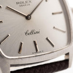 相較於較知名的運動型錶款,Rolex Cellini 系列展現了 Rolex 較為華麗的一面。此款腕錶採用 18K 白金方形錶殼,對 Rolex 而言,這是一種不尋常的錶殼形狀。