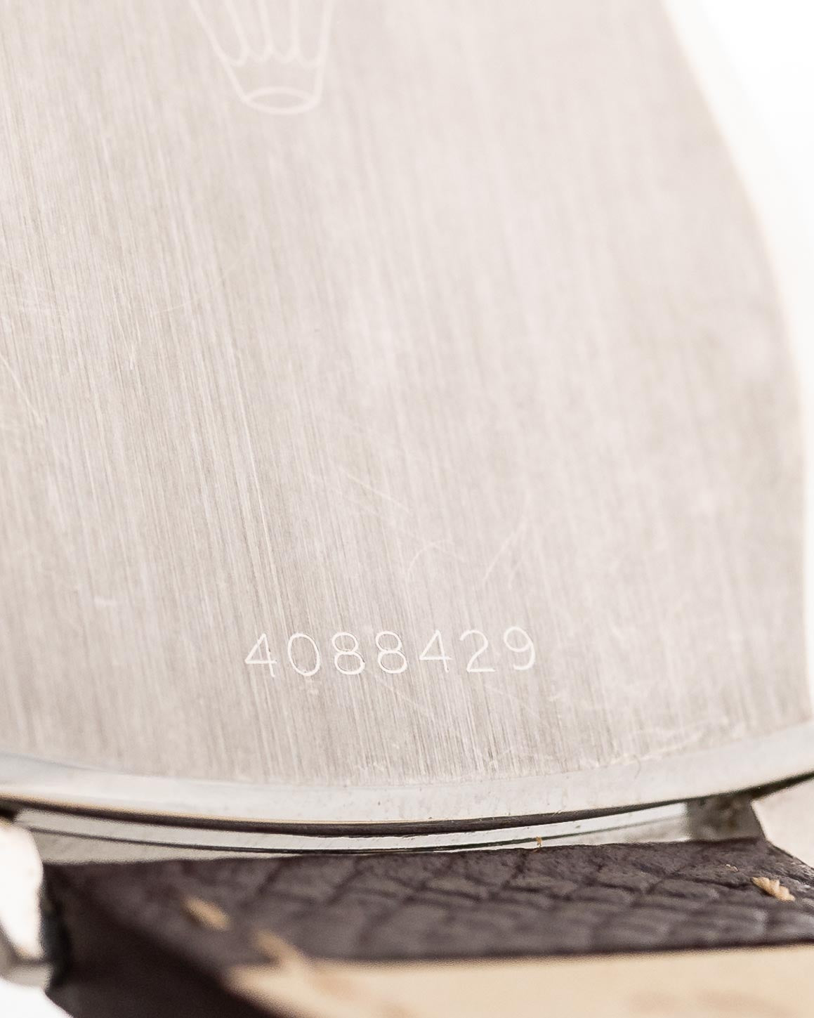 此款腕錶非常百搭,無論在休閒或出席黑色晚宴時都能舒適配戴。錶盤底部的 sigma 標誌表示時標和指針也是由 18K 白金製成。銀色的陽光紋錶盤與啞光錶圈形成強烈對比。本錶附有 1979 年的勞力士原廠證書。