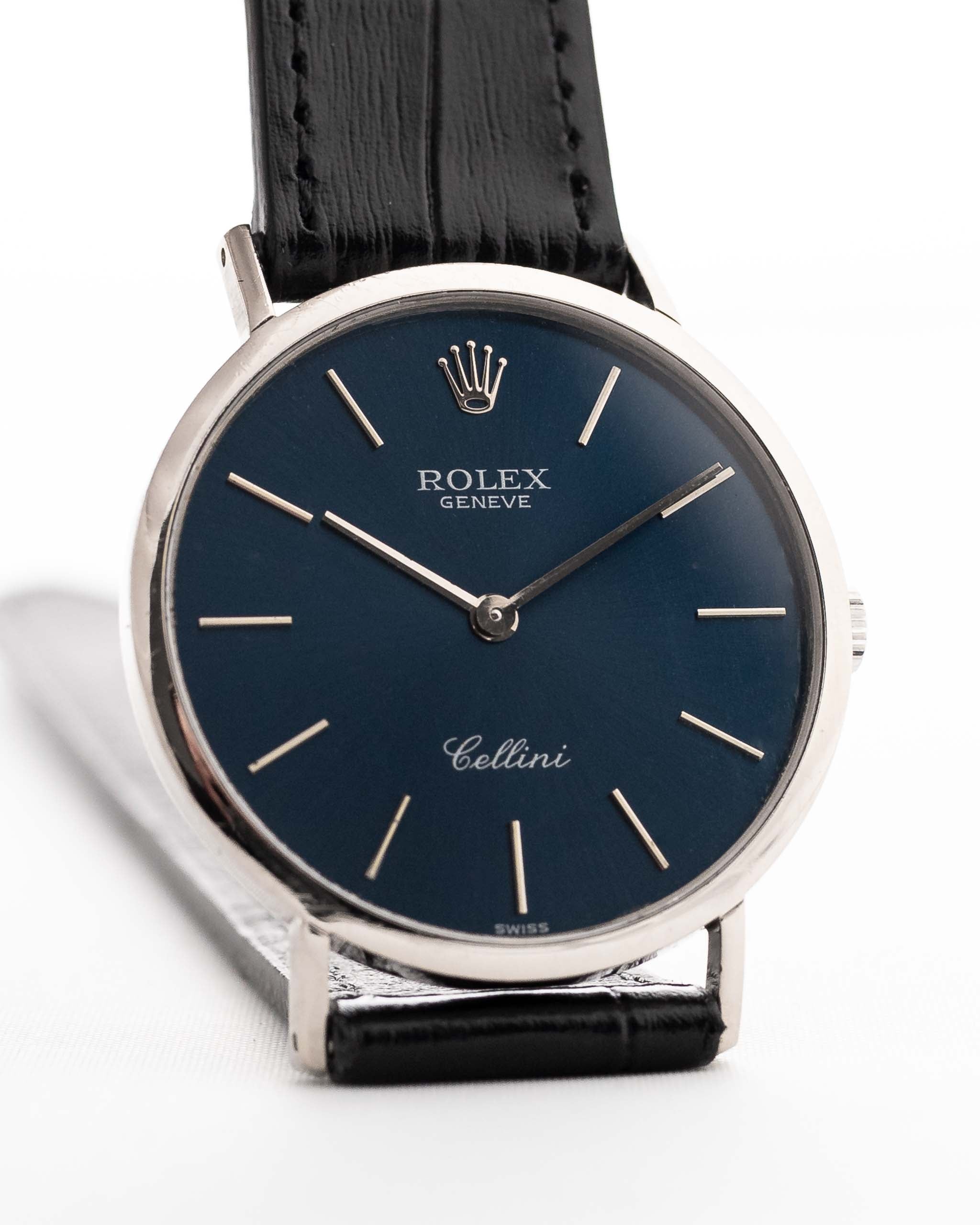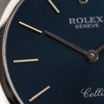 低調、優雅、罕見的配置 - Rolex Cellini Ref.4112 18K 白金款式將經典的 Calatrava 風格設計與令人著迷的海洋藍太陽放射狀錶盤完美結合,純粹的視覺詩意。