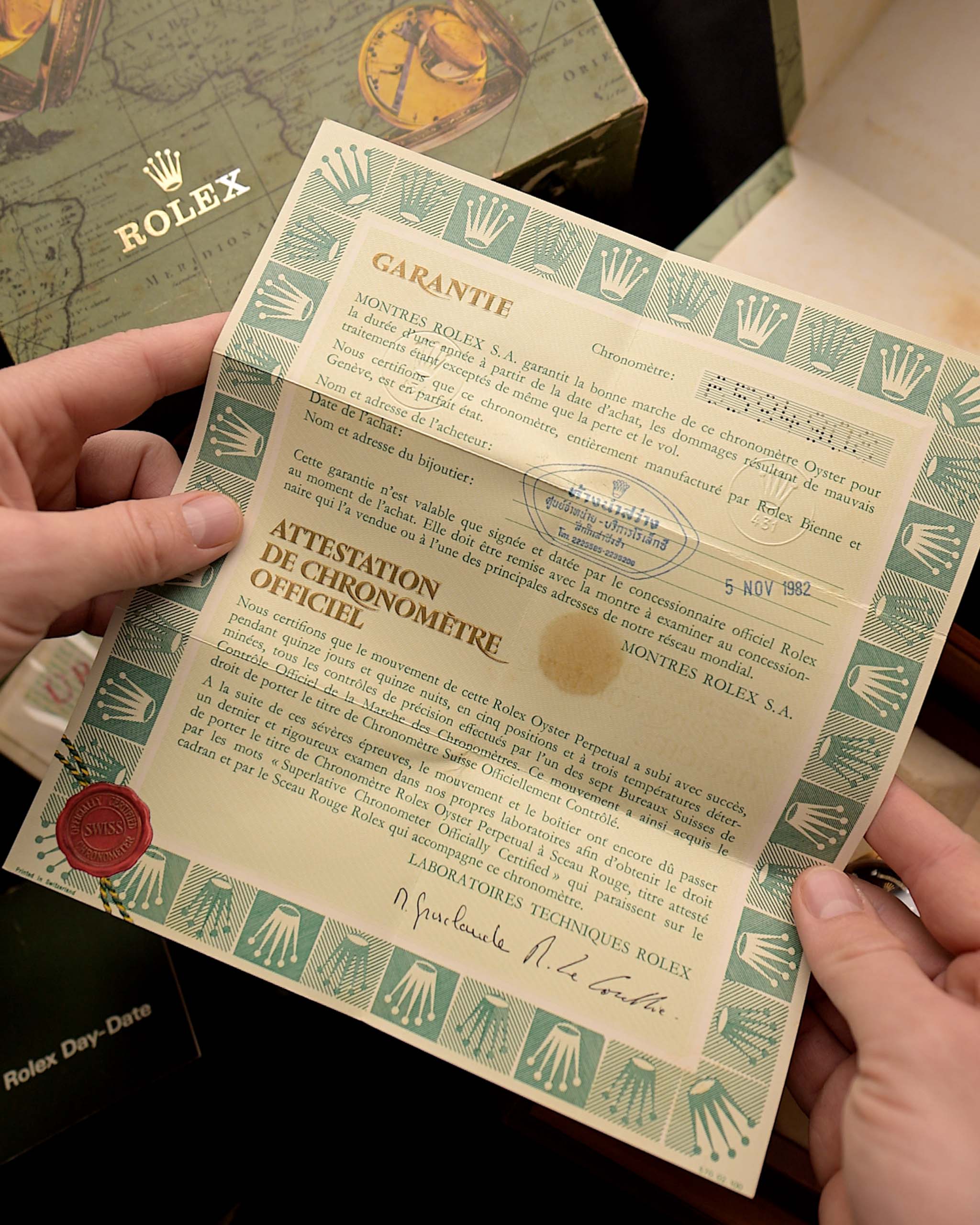 - 1982 年 11 月在泰國曼谷首次購買時的勞力士原始文件和吊牌 - 當時的價格為 188.850 泰銖,約合現在的 5.900 美元。