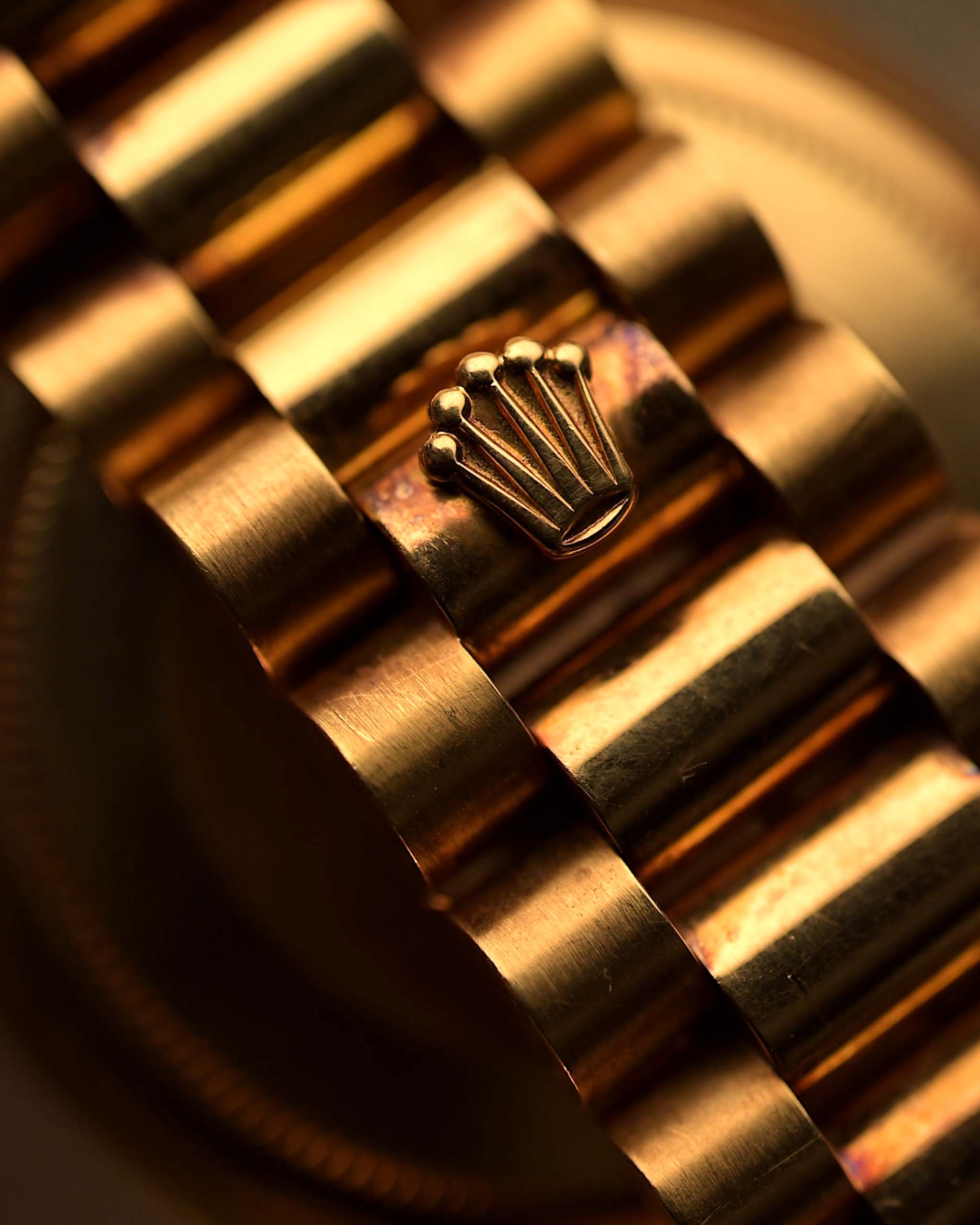 這枚1981 年出品的腕錶是罕見的珍品 -棕色飾紋錶盤搭配原廠鑽石時標。錶盤的深淺漸變效果,從暖金色的中央到深色的外緣,賦予其深度與特色。18K 黃金錶殼和總統錶鏈經過溫和的歲月洗禮,腕錶散發著溫暖而真實的氣息 - 只有數十年的沉穩自信才能創造出這種自然的銅綠色澤。