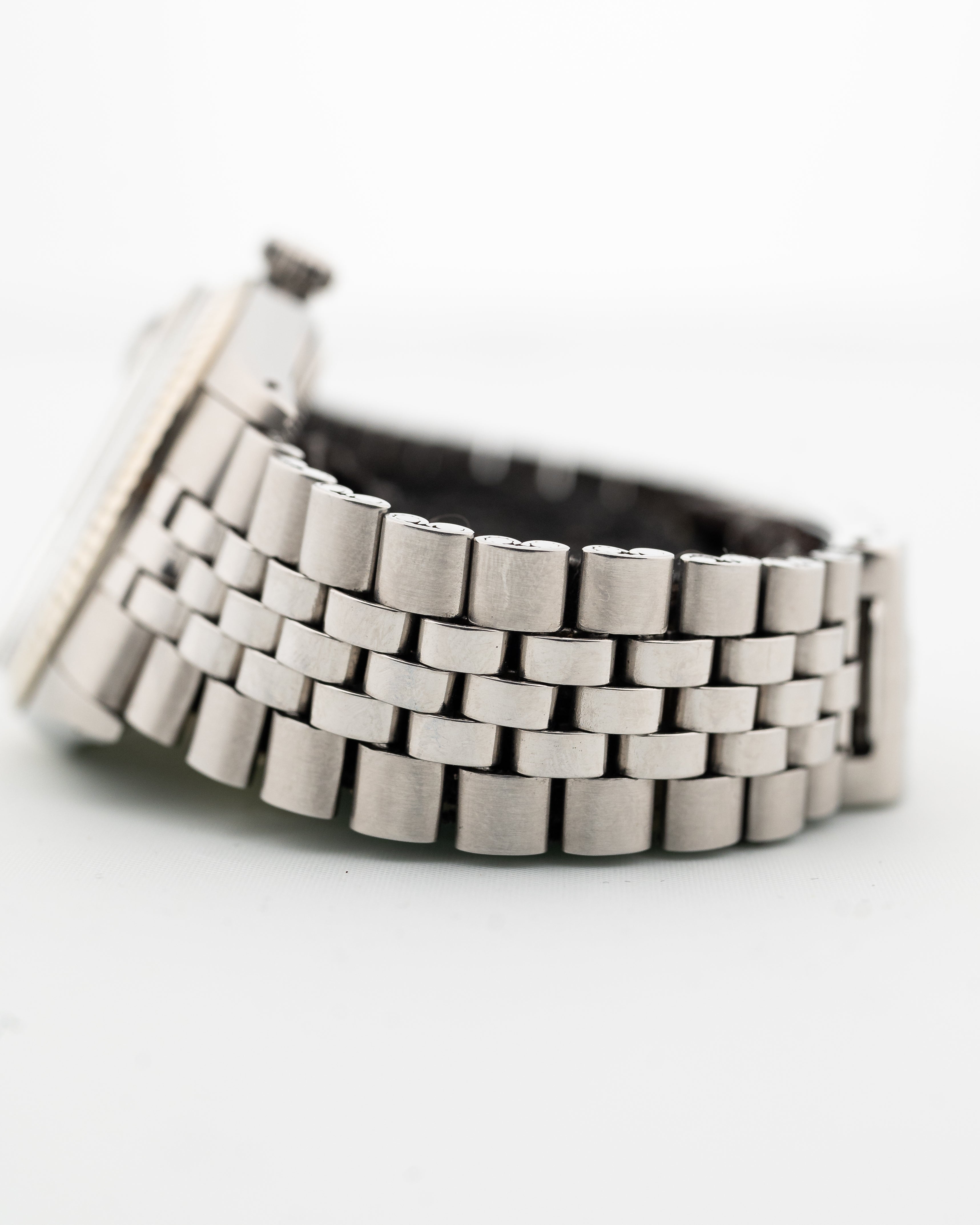 這款來自 1974 年的特別作品以其 18K 白金凹槽表圈、完美無瑕的銀色陽光紋餡餅盤錶盤以及非常堅固且邊緣銳利的錶殼而著稱,保存狀況極佳。