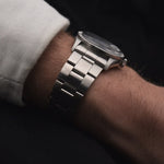 這款腕錶以耐用的不銹鋼材質包覆,配備引擎拋光的平面錶圈,飾以寧靜的海洋藍錶盤,輔以精鋼指針和時標,是簡約與優雅的縮影。